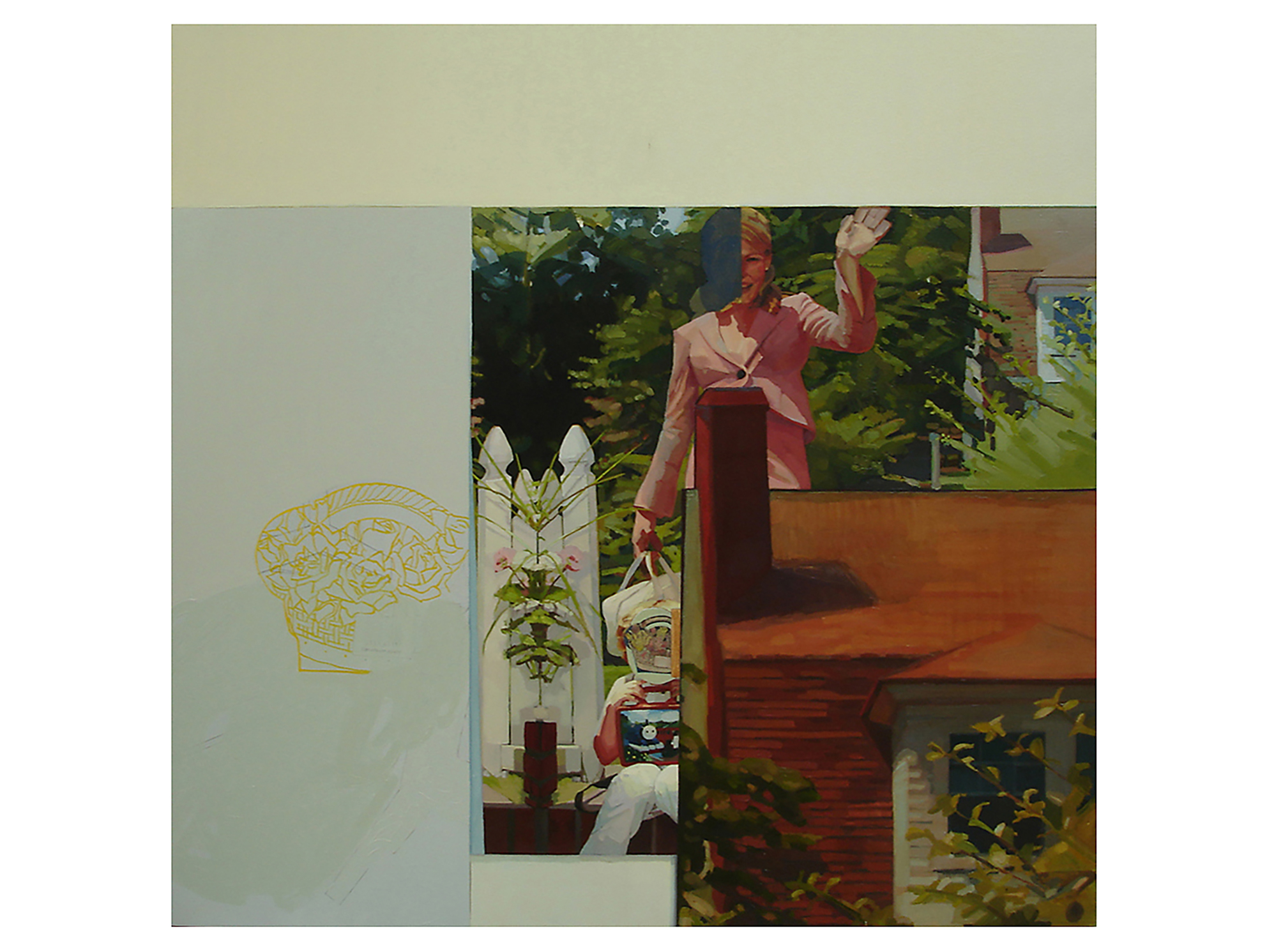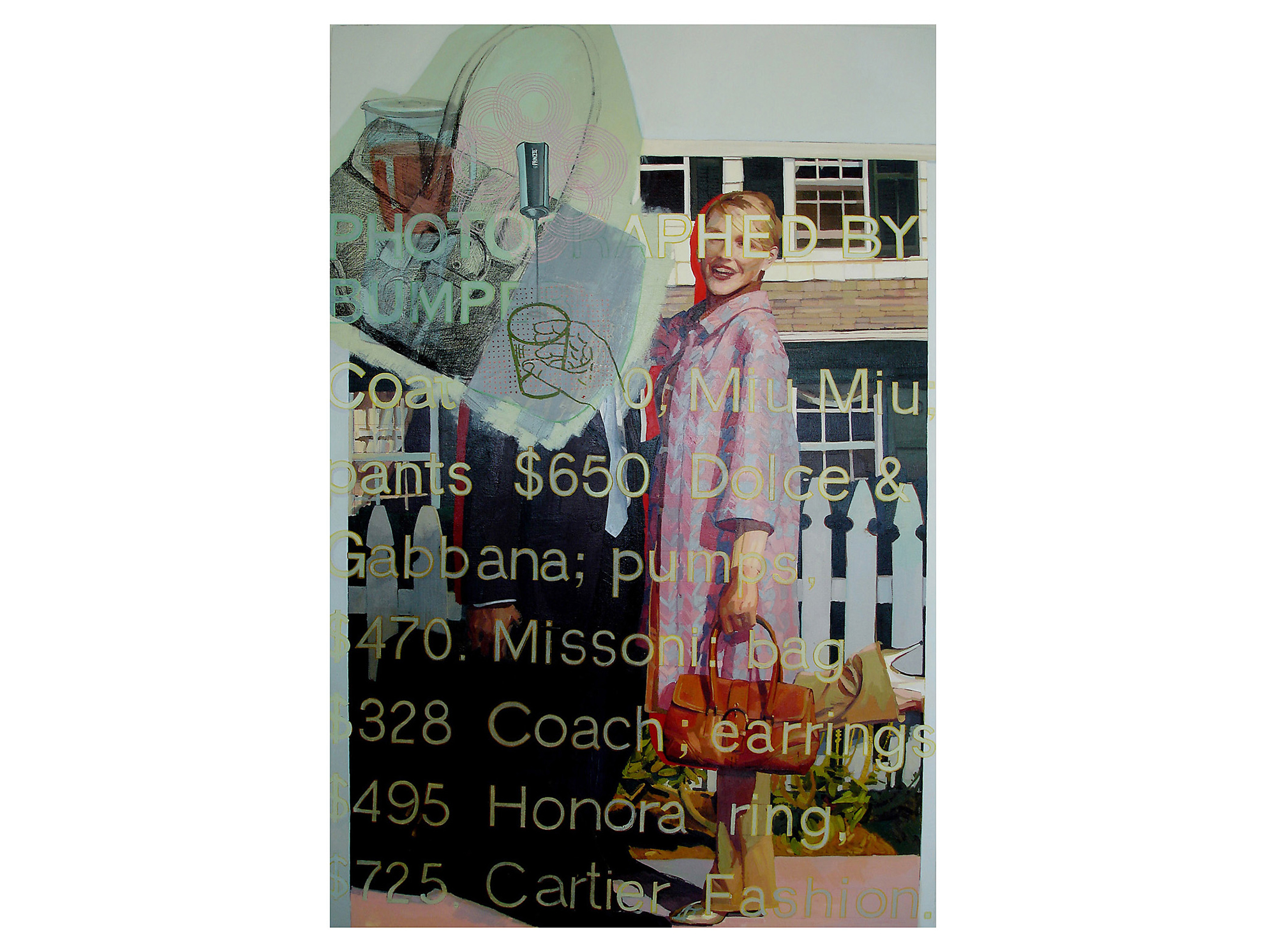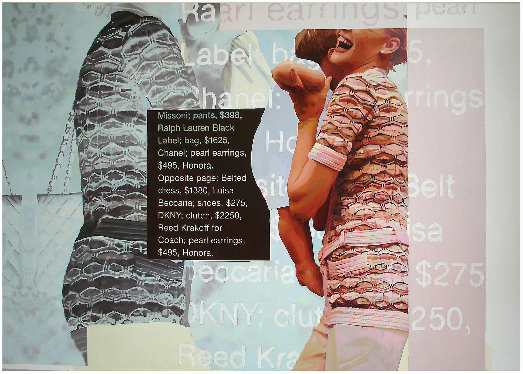 Serie de cinco pinturas que parte de la apropiación de fotografías de un reportaje de la revista Marie Claire, Octubre 2002, donde se presenta, con glamour, a una mujer junto a su pareja y/o hijos, su entorno y sus actividades. Las pinturas no replican las imágenes originales: introducen variaciones de color, escala y repetición que alteran la relación entre los personajes y el espacio, y superponen —ampliado— el texto con marcas y costos de producción y vestuario.