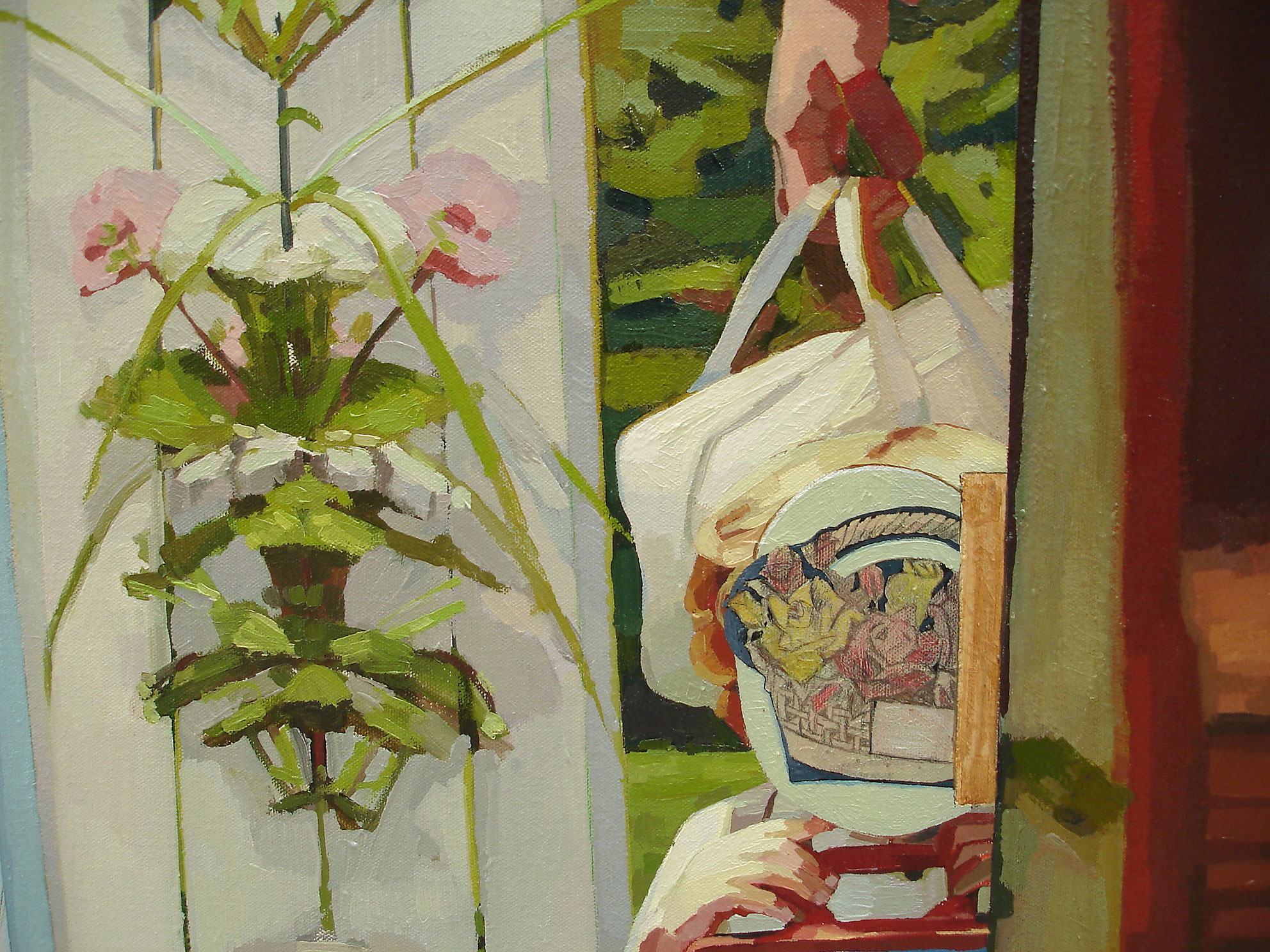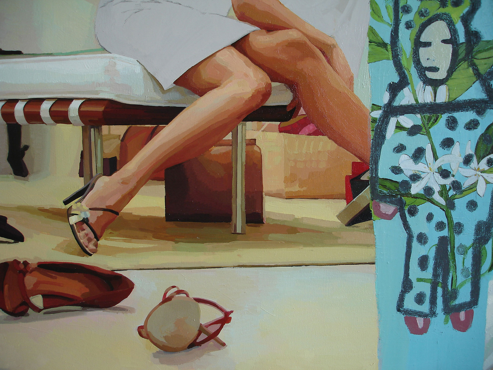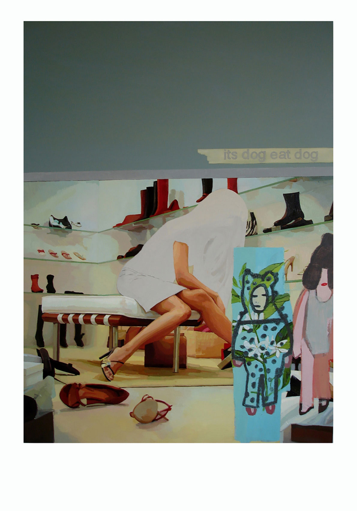 Serie de cinco pinturas que parte de la apropiación de fotografías de un reportaje de la revista Marie Claire, Octubre 2002, donde se presenta, con glamour, a una mujer junto a su pareja y/o hijos, su entorno y sus actividades. Las pinturas no replican las imágenes originales: introducen variaciones de color, escala y repetición que alteran la relación entre los personajes y el espacio, y superponen —ampliado— el texto con marcas y costos de producción y vestuario.