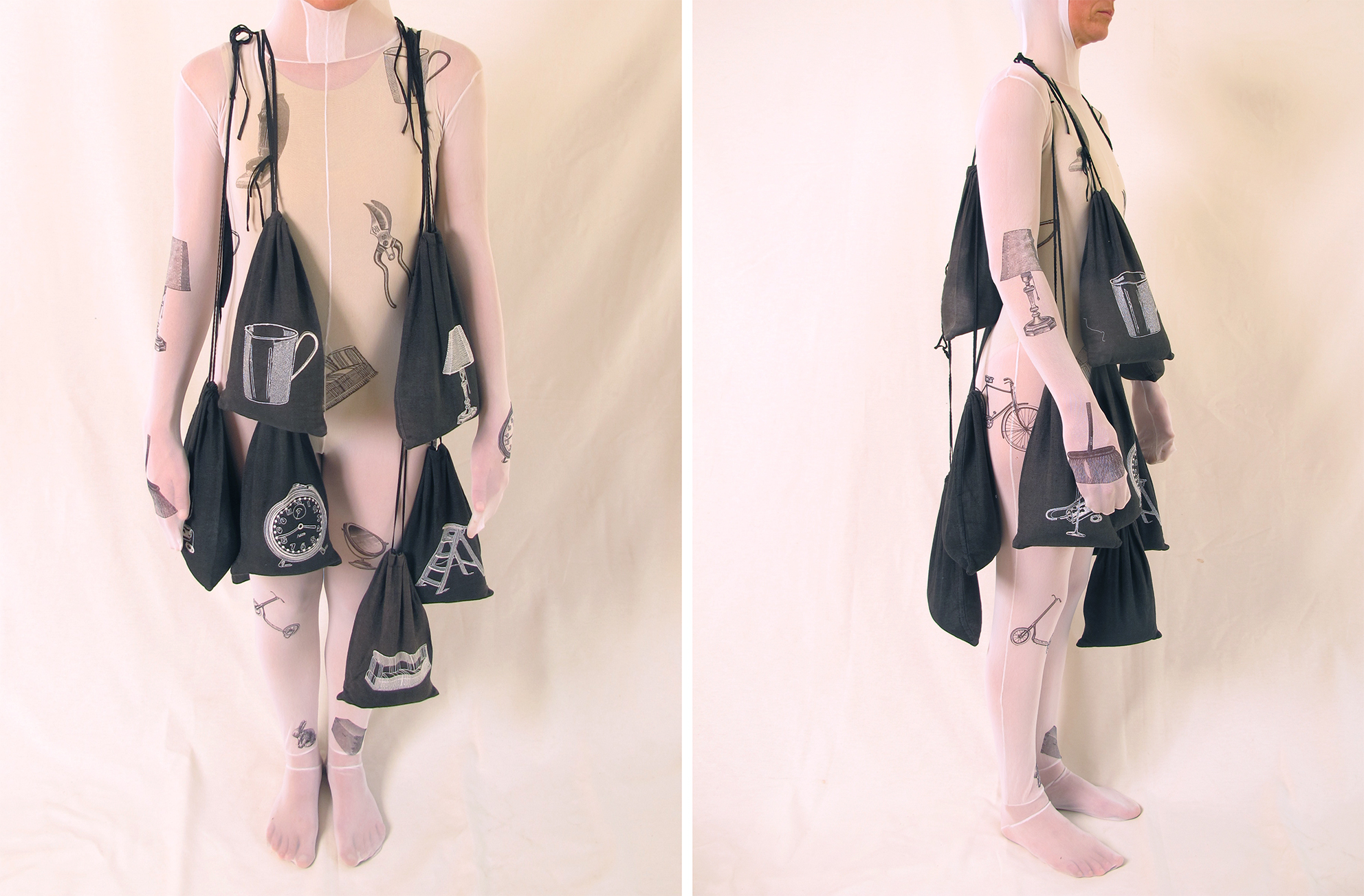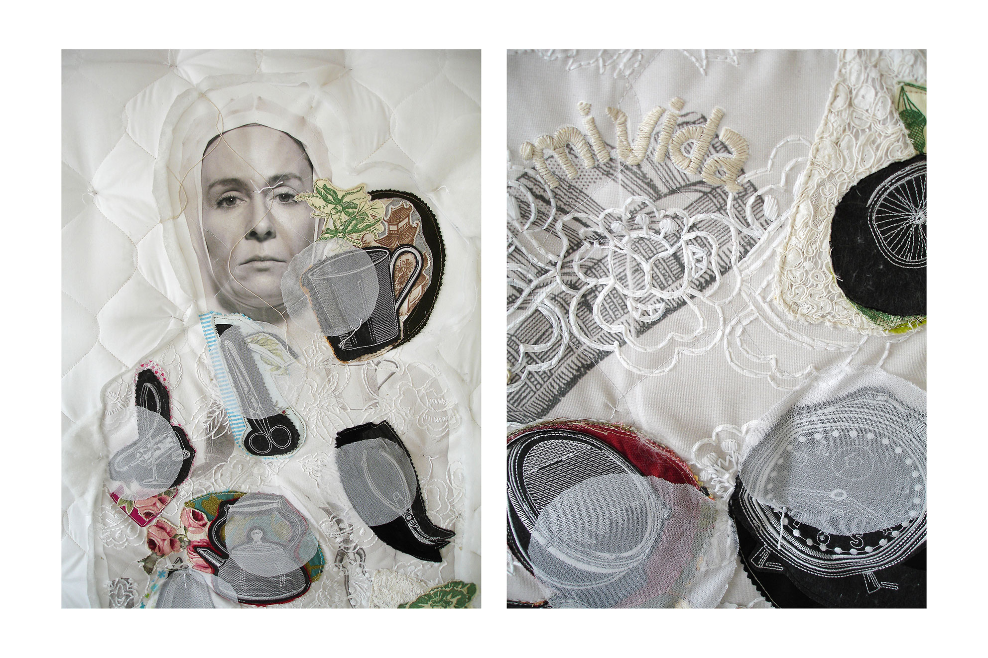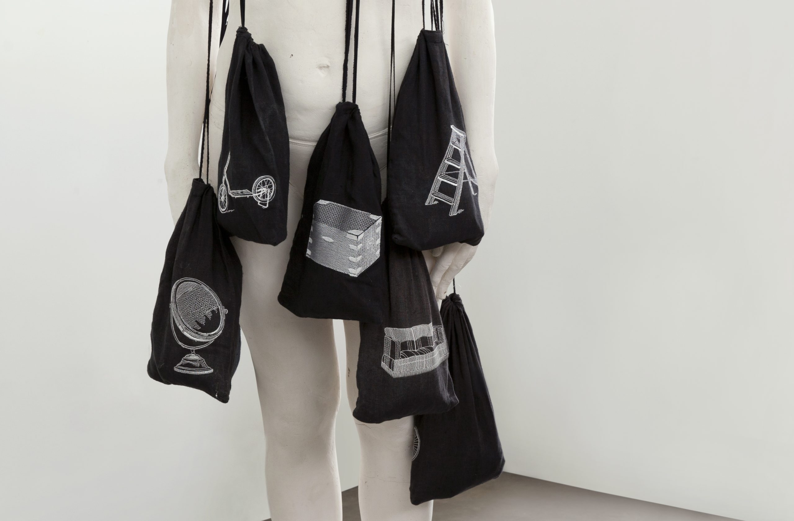 El Ekeko es una deidad andina de la abundancia, la fertilidad y la alegría, originaria del altiplano (Bolivia, Perú, norte de Chile y Argentina). Es un amuleto popular representado como un hombre pequeño y sonriente cargado de miniaturas que simbolizan los deseos de los creyentes, como dinero, alimentos o casas. Inspirada en esta noción, y la posibilidad de materializar la tension existente entre obligación y deseo, hice de mi misma un Ekeko-mujer cargada de la parafernalia de los deberes domésticos socialmente situados en el cuerpo de la mujer. Produje 3 variaciones. El primero es yo-ekeko. Utiliza como soporte mi cuerpo vestido con un traje blanco estampado en negro con una selección de dibujos de objetos domésticos. Además carga sobre los hombros bolsas negras llenas de arena que tienen bordadas la misma selección de dibujos. El segundo Ekeko es un yo-ekeko-colchón. Escojo el colchón como aquello que recibe sobre si el peso de uno o varios cuerpos. Mi colchón tiene estampada la foto de yo-Ekeko y sobre este estampado tiene un bordado popular andino de flores y un bordado de cada uno de los dibujos de objetos domésticos acompañados de telas de colores y/o con diseños florales y decorativos. El tercer Ekeko yo-ekeko-yo es una replica de mi cuerpo hecho en yeso blanco (a partir de un molde). Esta versión carga sobre sus hombros las mismas bolsas negras bordadas con los dibujos y llenas de arena.
