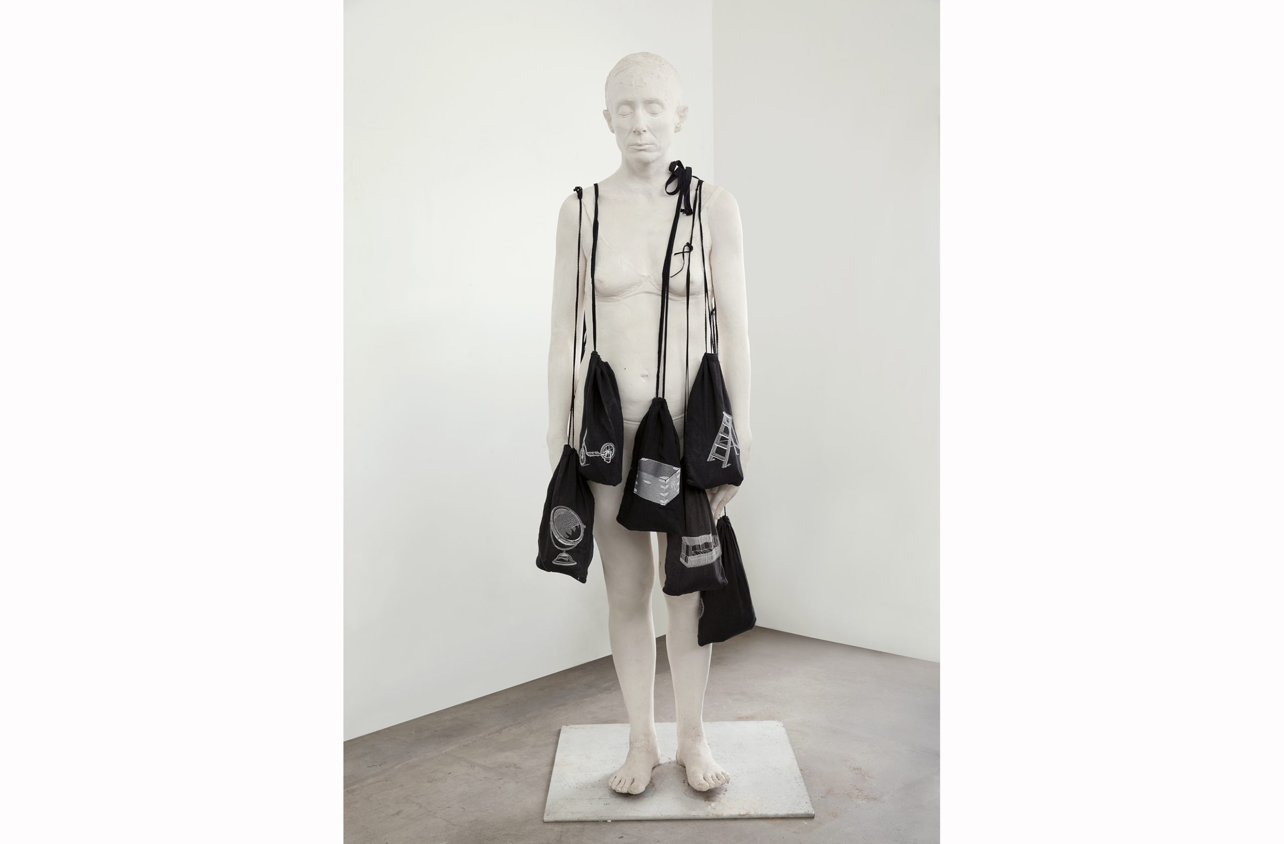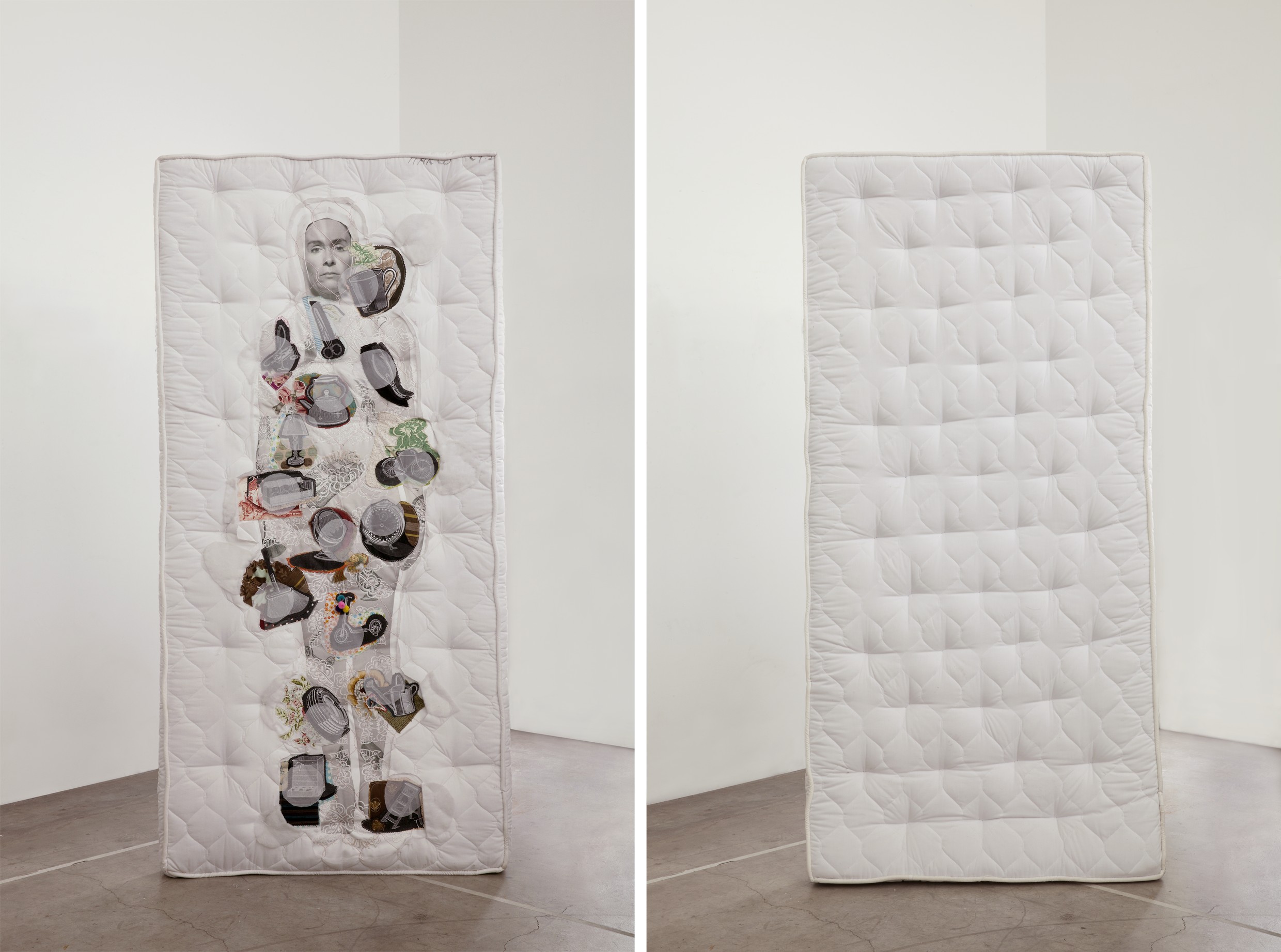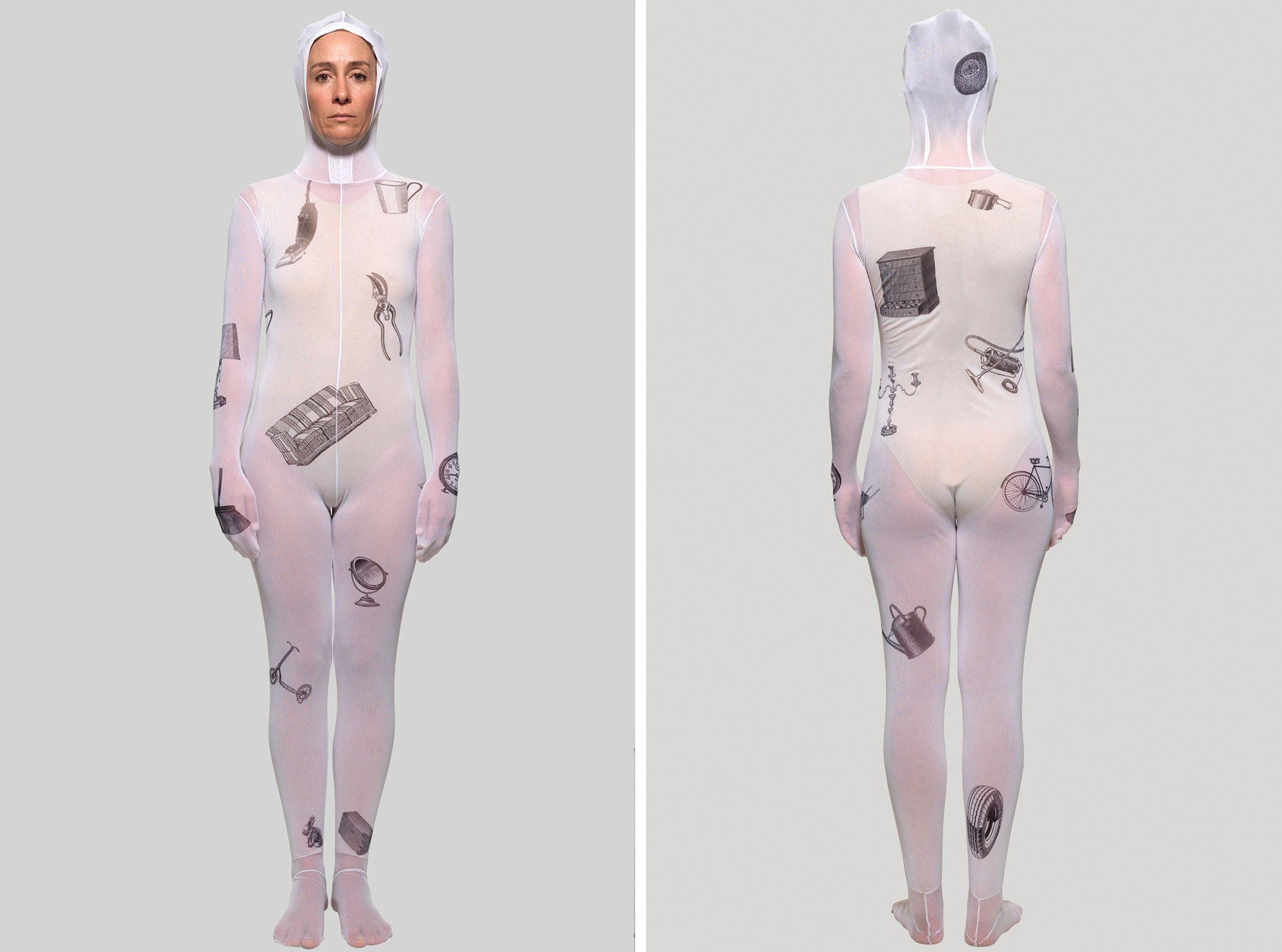 El Ekeko es una deidad andina de la abundancia, la fertilidad y la alegría, originaria del altiplano (Bolivia, Perú, norte de Chile y Argentina). Es un amuleto popular representado como un hombre pequeño y sonriente cargado de miniaturas que simbolizan los deseos de los creyentes, como dinero, alimentos o casas. Inspirada en esta noción, y la posibilidad de materializar la tension existente entre obligación y deseo, hice de mi misma un Ekeko-mujer cargada de la parafernalia de los deberes domésticos socialmente situados en el cuerpo de la mujer. Produje 3 variaciones. El primero es yo-ekeko. Utiliza como soporte mi cuerpo vestido con un traje blanco estampado en negro con una selección de dibujos de objetos domésticos. Además carga sobre los hombros bolsas negras llenas de arena que tienen bordadas la misma selección de dibujos. El segundo Ekeko es un yo-ekeko-colchón. Escojo el colchón como aquello que recibe sobre si el peso de uno o varios cuerpos. Mi colchón tiene estampada la foto de yo-Ekeko y sobre este estampado tiene un bordado popular andino de flores y un bordado de cada uno de los dibujos de objetos domésticos acompañados de telas de colores y/o con diseños florales y decorativos. El tercer Ekeko yo-ekeko-yo es una replica de mi cuerpo hecho en yeso blanco (a partir de un molde). Esta versión carga sobre sus hombros las mismas bolsas negras bordadas con los dibujos y llenas de arena.