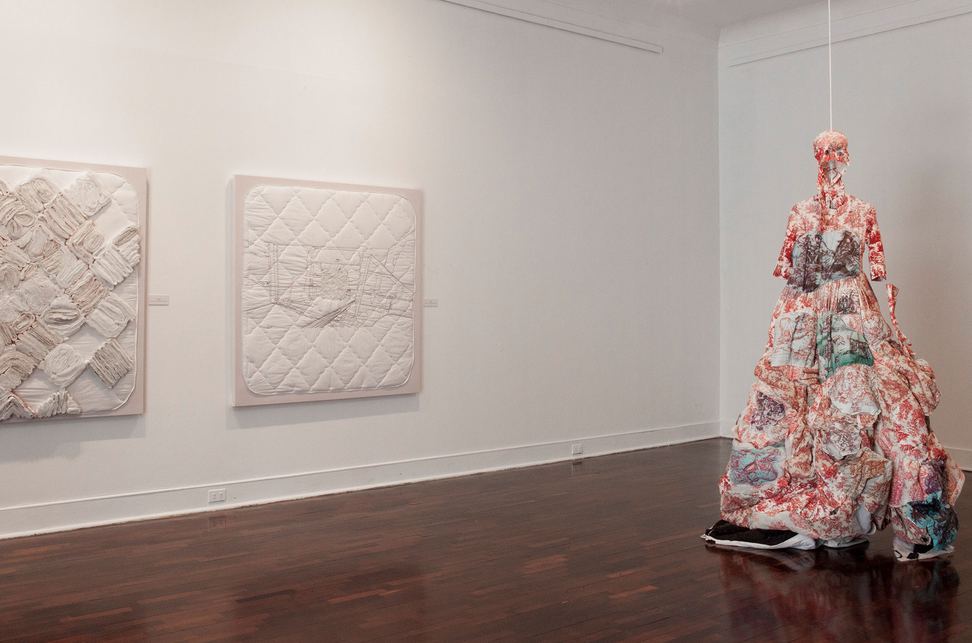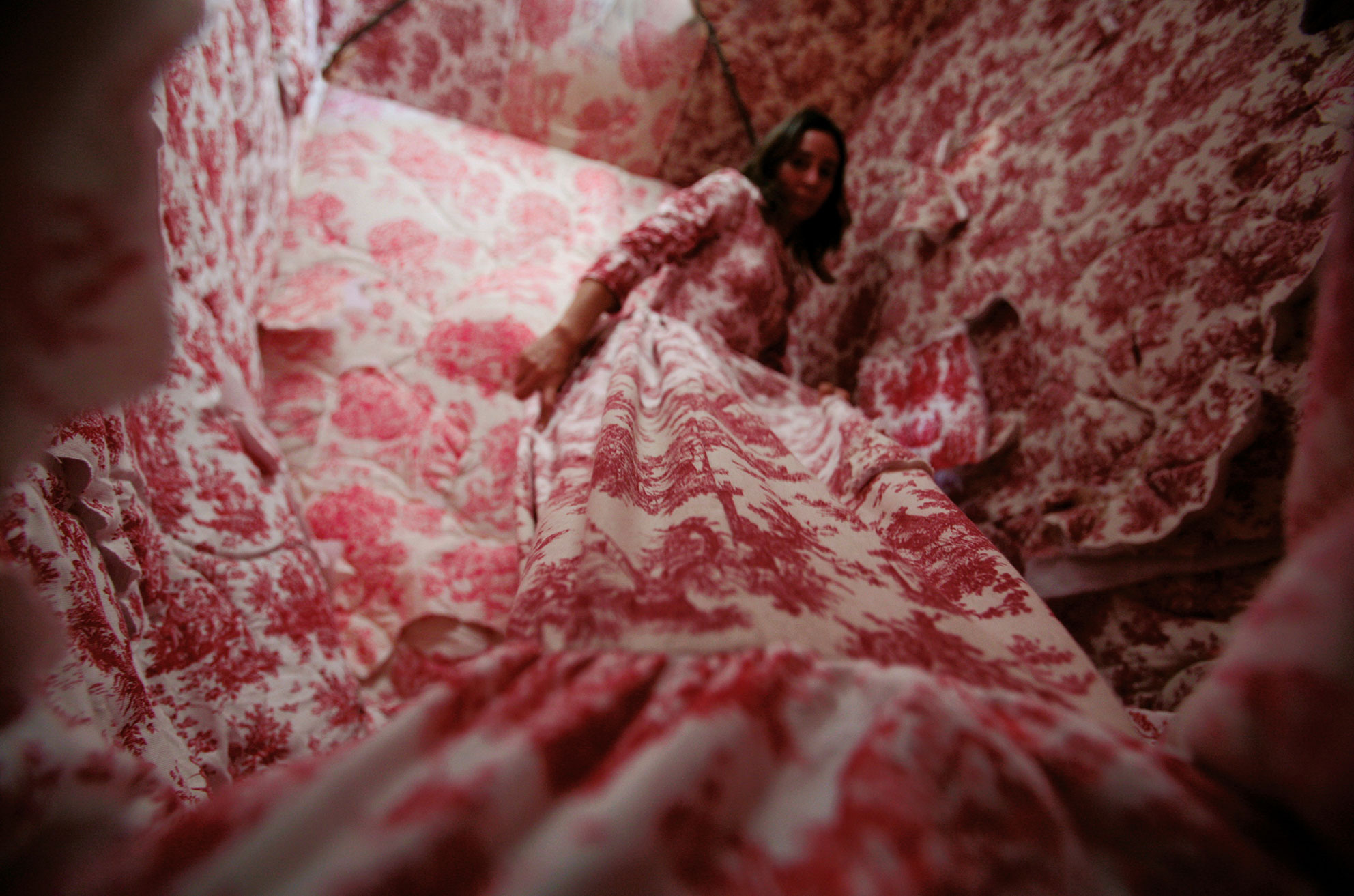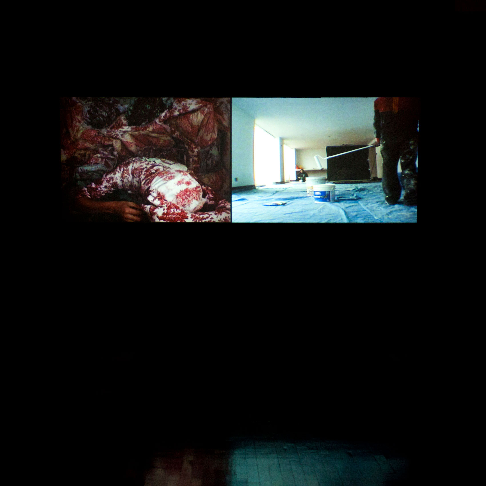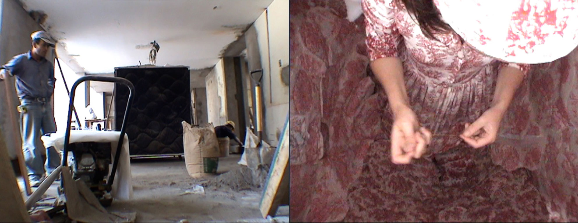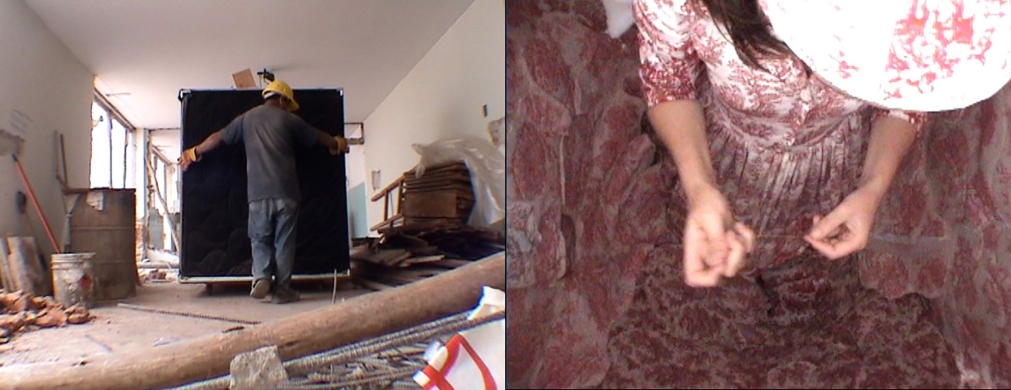 La exposición Ocupa explora la relación entre el cuerpo de mujer, el espacio y las formas de control y aislamiento a través de imágenes, esculturas de pequeńo formato, bordados y, principalmente, la video-instalación Ocupa en dos canales. El contraste entre la construcción de una casa por obreros y la acción íntima de la artista, que construye un refugio con tela, aguja e hilo, genera una tensión donde no queda claro si ese espacio es protección o encierro. La deconstrucción de la tela Toile de Jouy —con sus escenas idílicas— introduce una fricción entre esos imaginarios y la experiencia del cuerpo.