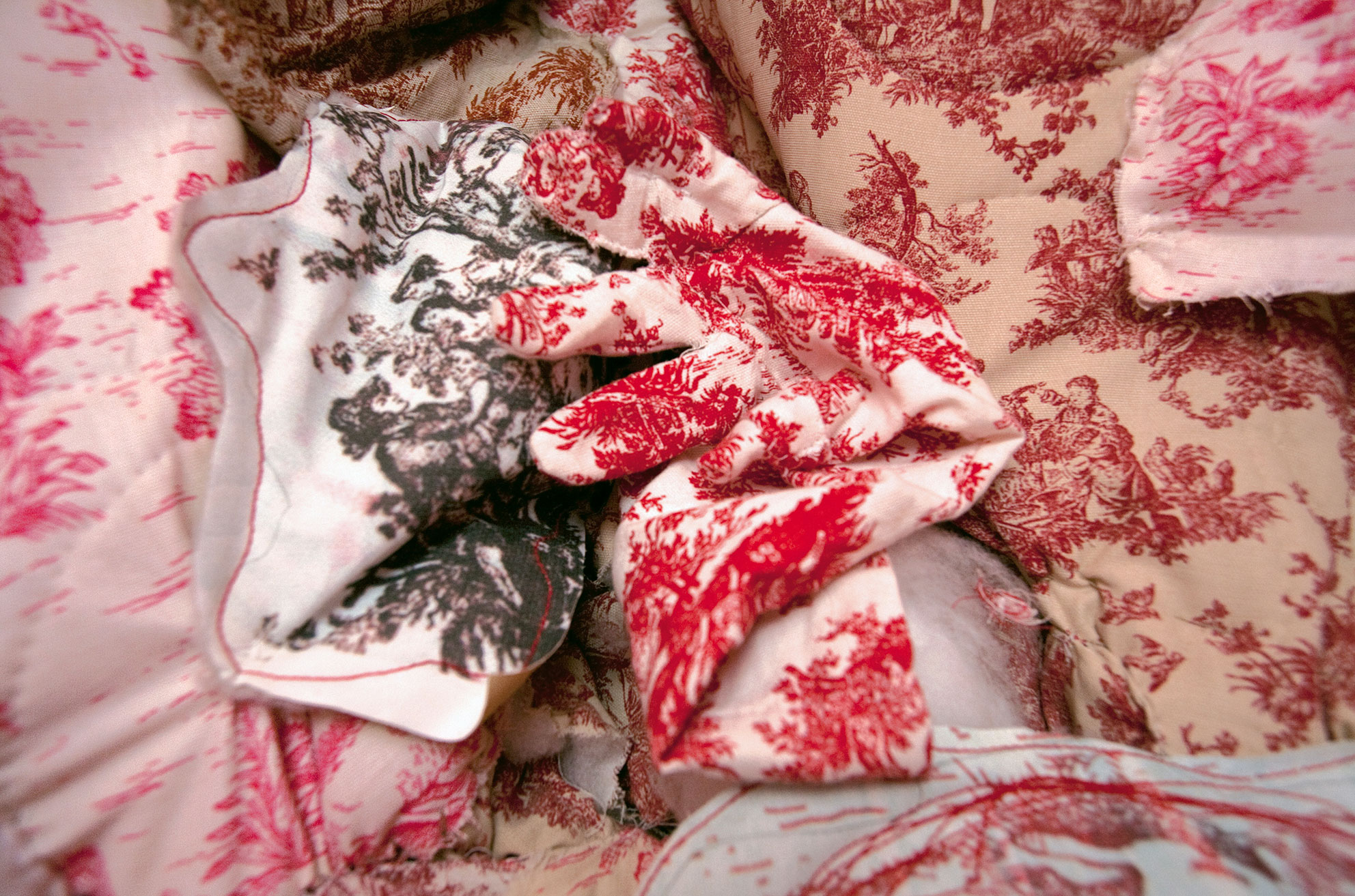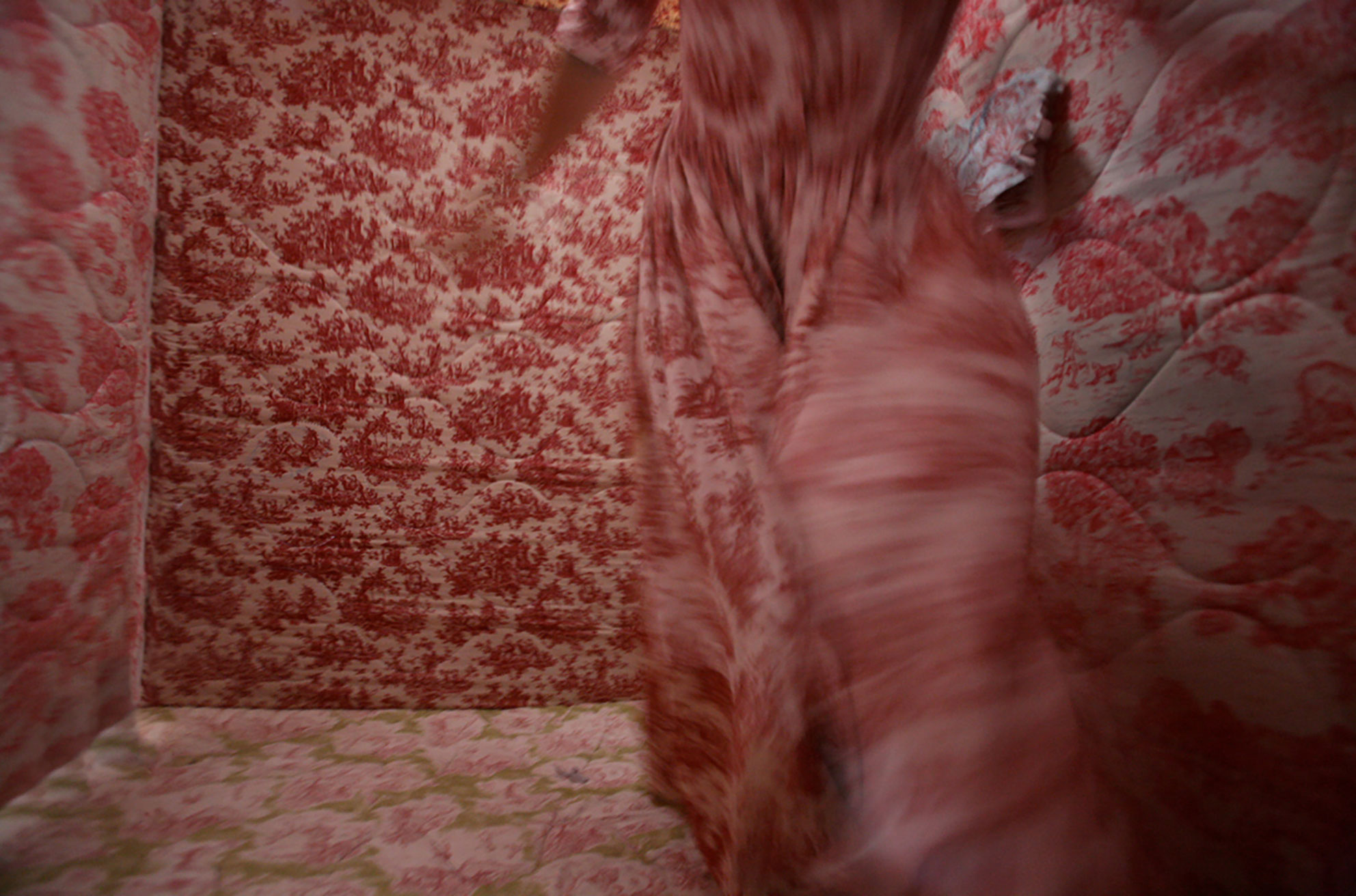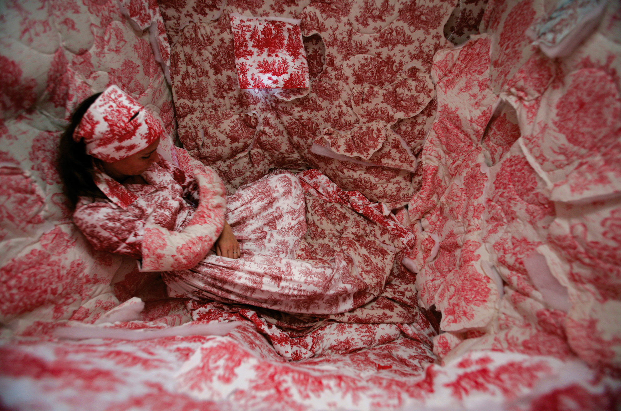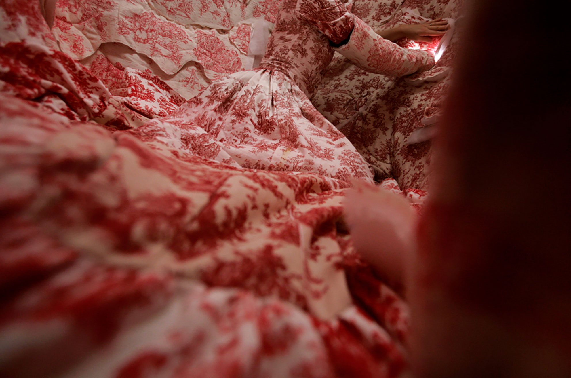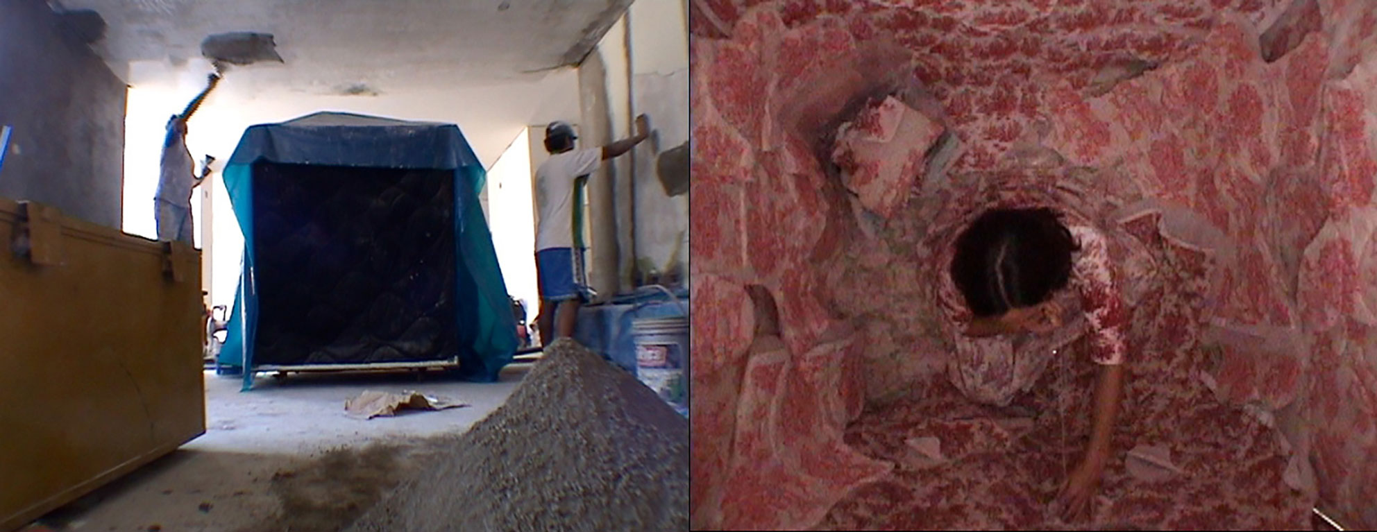 La exposición Ocupa explora la relación entre el cuerpo de mujer, el espacio y las formas de control y aislamiento a través de imágenes, esculturas de pequeńo formato, bordados y, principalmente, la video-instalación Ocupa en dos canales. El contraste entre la construcción de una casa por obreros y la acción íntima de la artista, que construye un refugio con tela, aguja e hilo, genera una tensión donde no queda claro si ese espacio es protección o encierro. La deconstrucción de la tela Toile de Jouy —con sus escenas idílicas— introduce una fricción entre esos imaginarios y la experiencia del cuerpo.