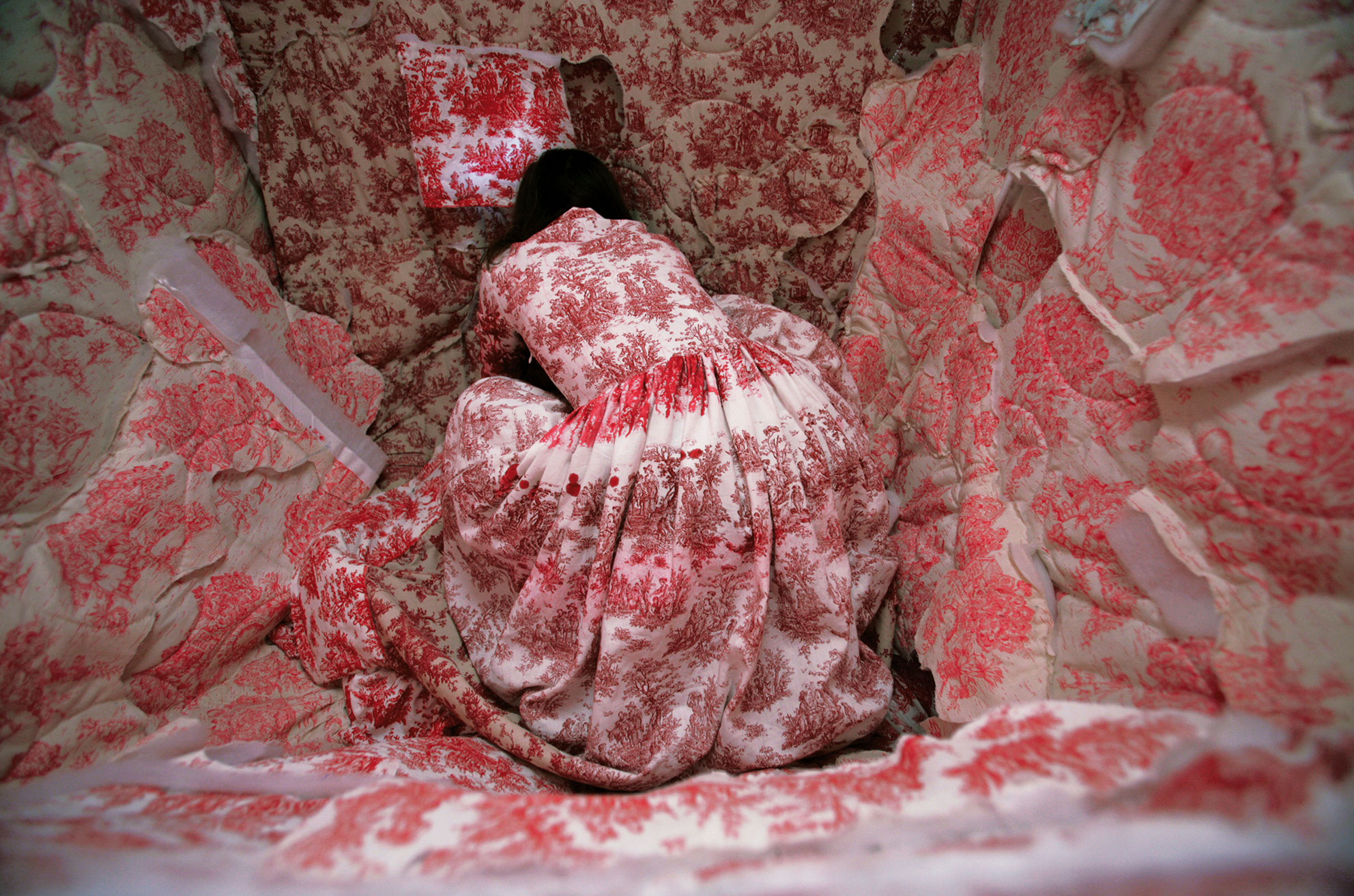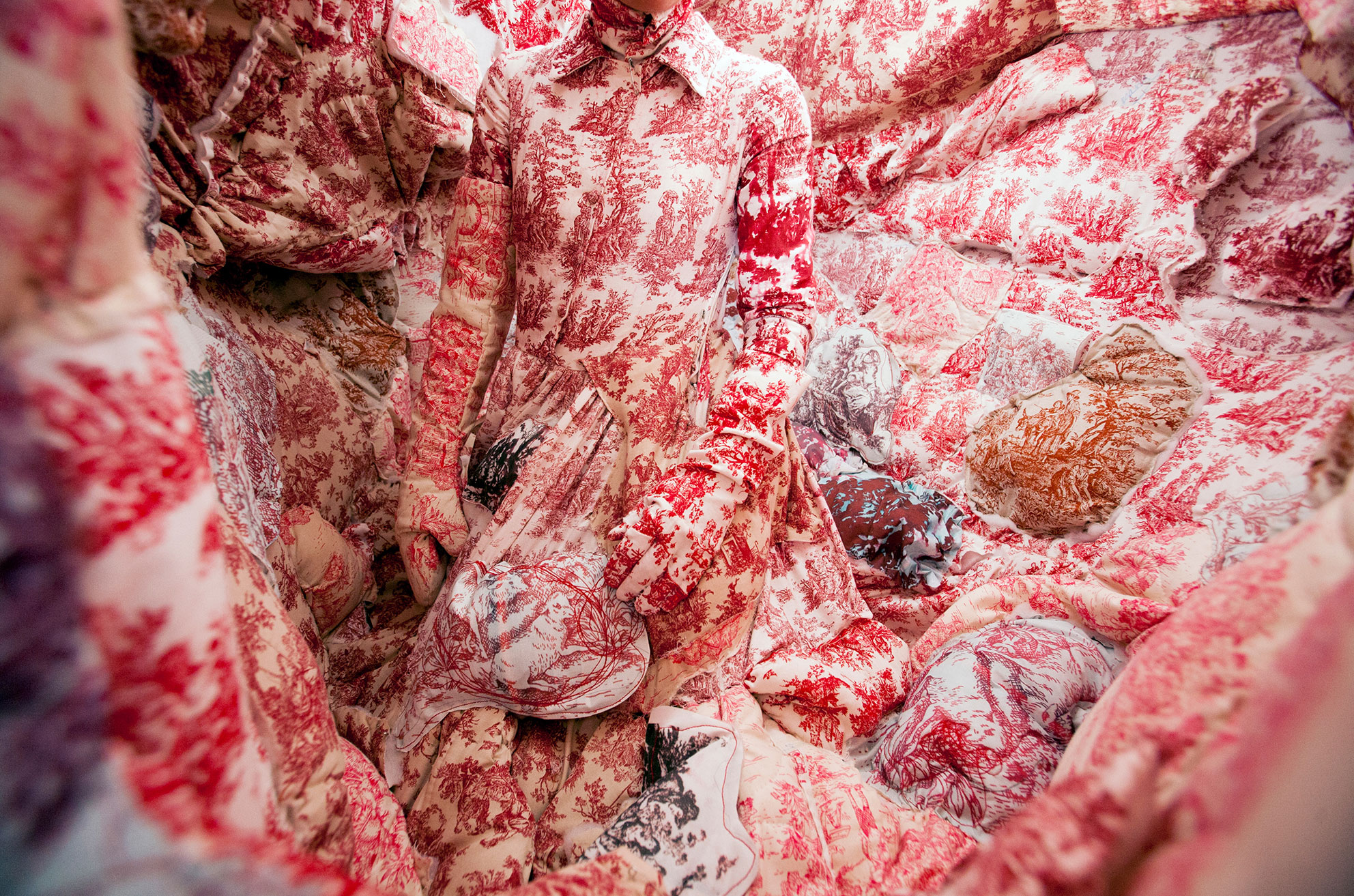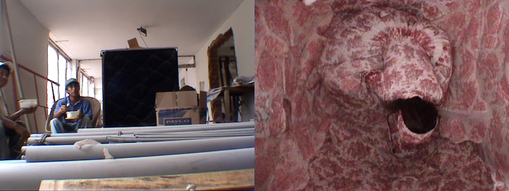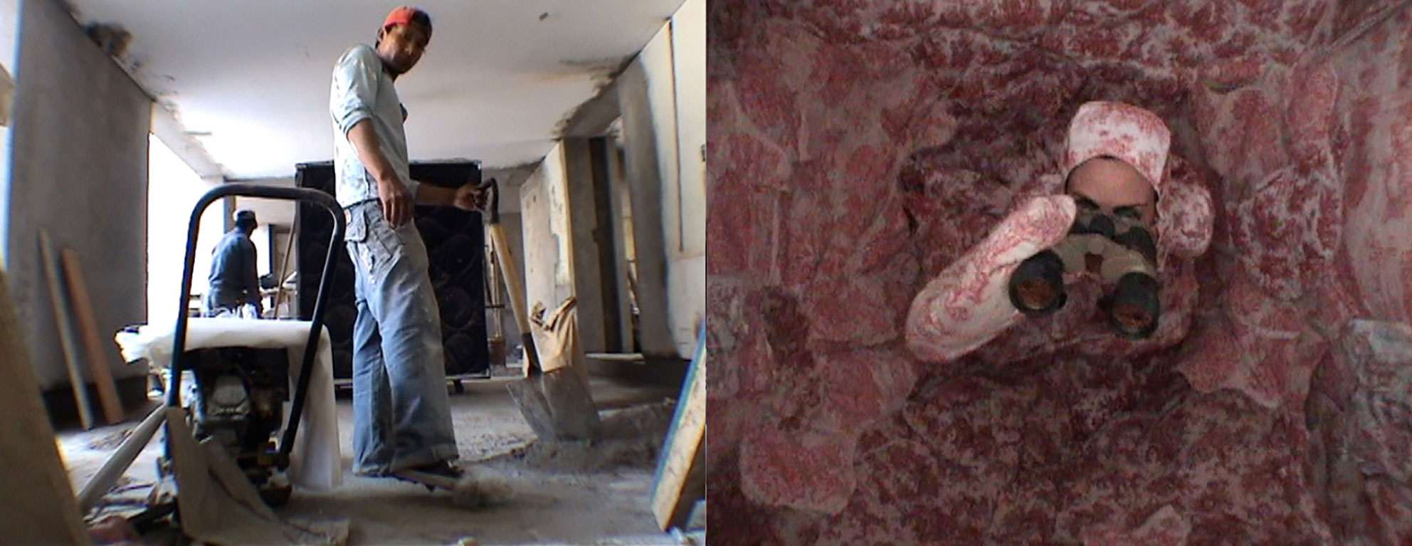 La exposición Ocupa explora la relación entre el cuerpo de mujer, el espacio y las formas de control y aislamiento a través de imágenes, esculturas de pequeńo formato, bordados y, principalmente, la video-instalación Ocupa en dos canales. El contraste entre la construcción de una casa por obreros y la acción íntima de la artista, que construye un refugio con tela, aguja e hilo, genera una tensión donde no queda claro si ese espacio es protección o encierro. La deconstrucción de la tela Toile de Jouy —con sus escenas idílicas— introduce una fricción entre esos imaginarios y la experiencia del cuerpo.
