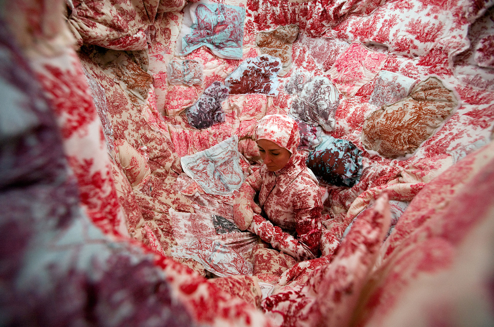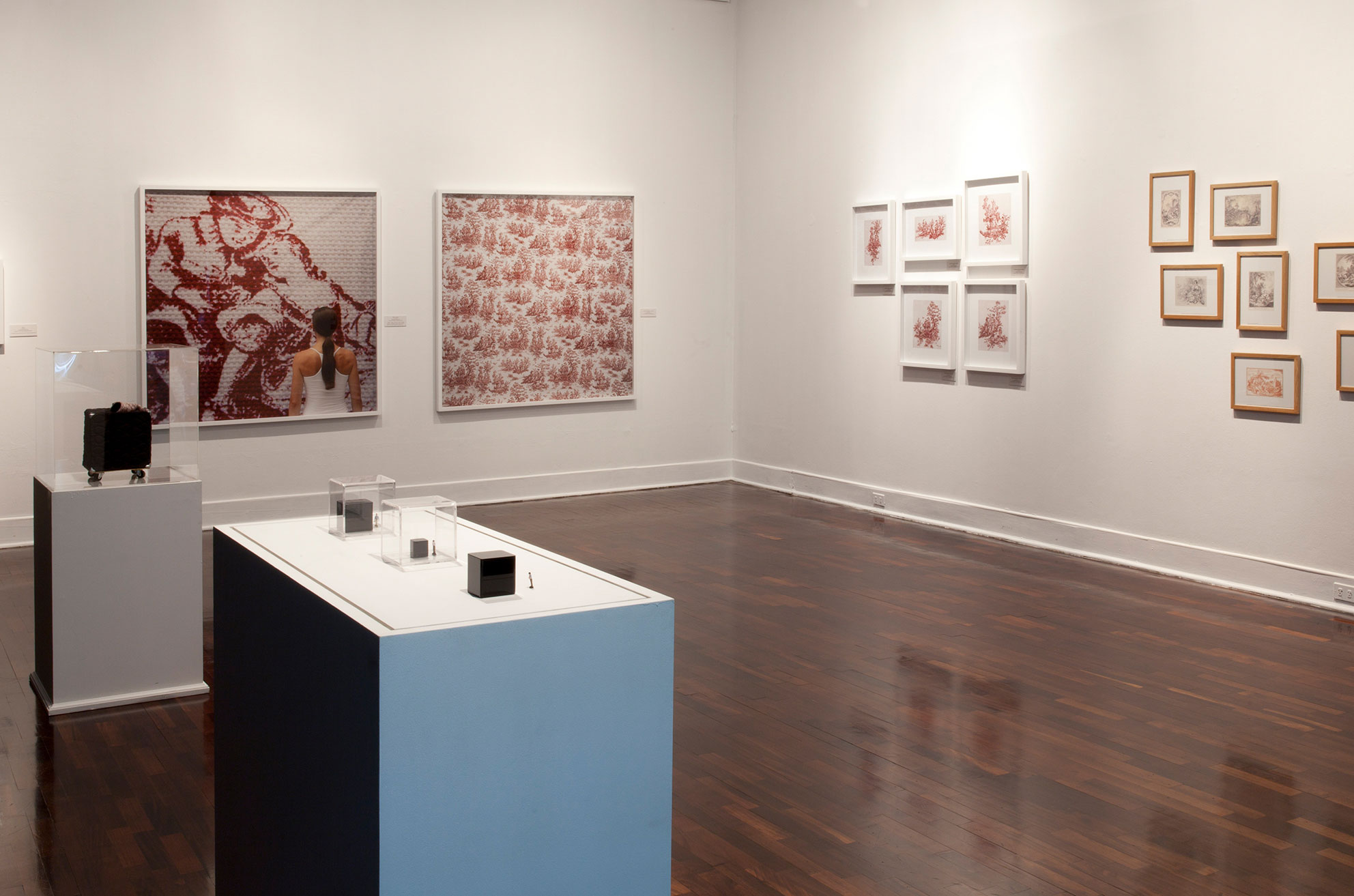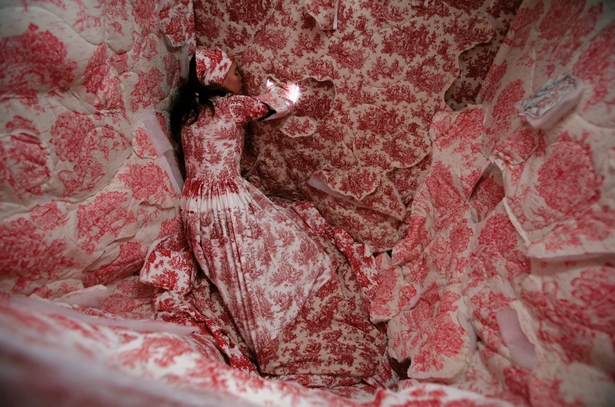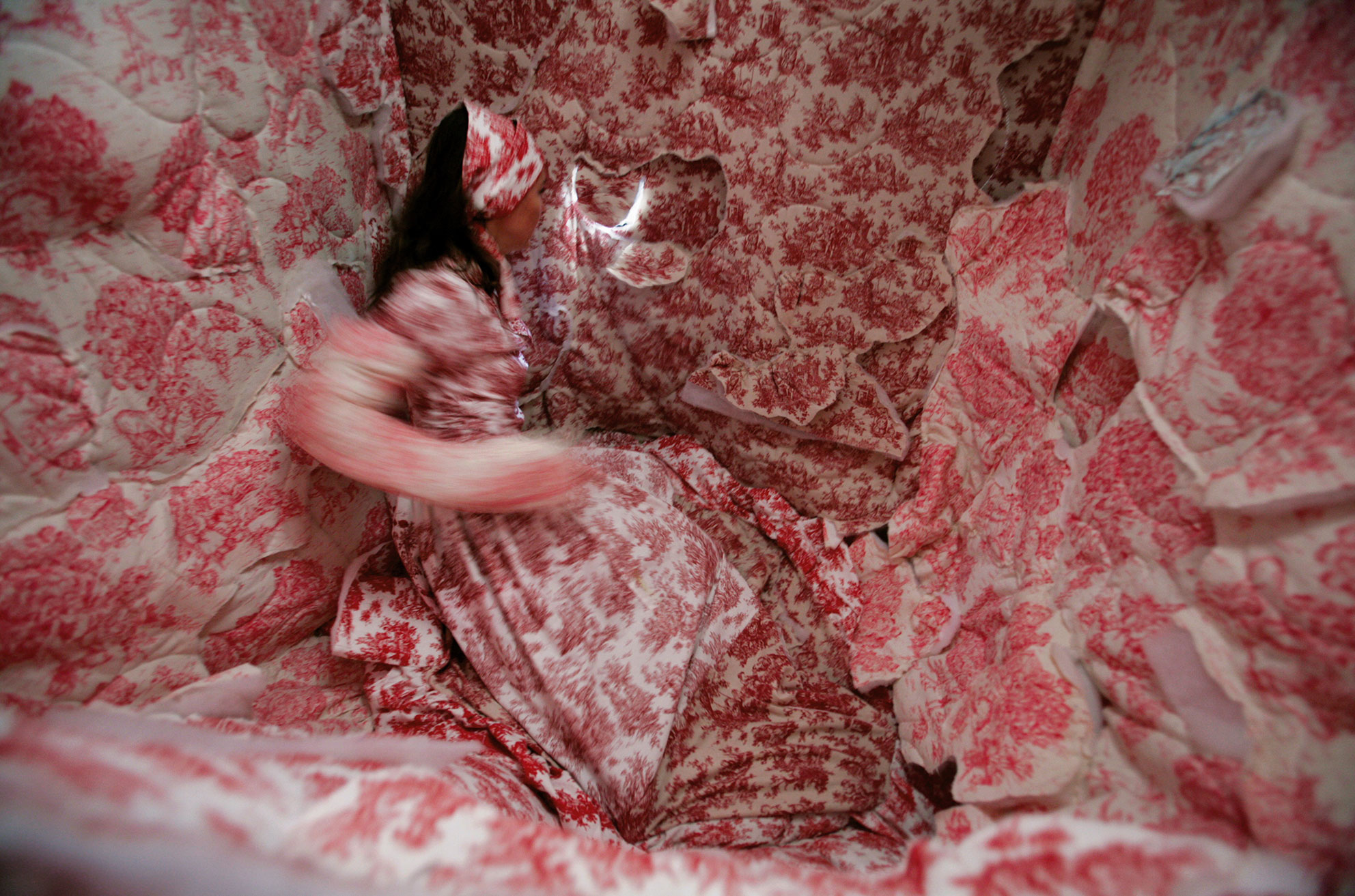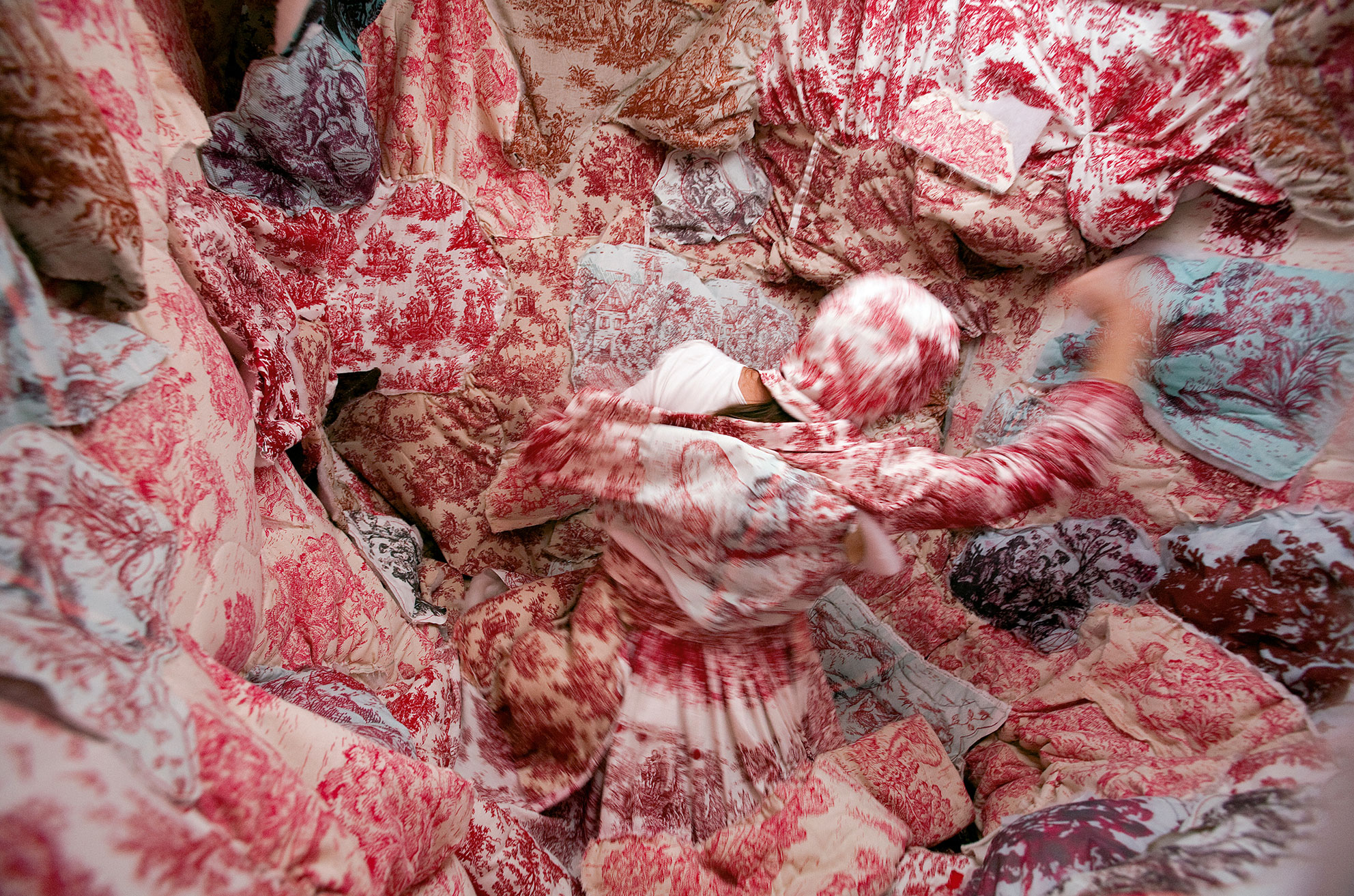 La exposición Ocupa explora la relación entre el cuerpo de mujer, el espacio y las formas de control y aislamiento a través de imágenes, esculturas de pequeńo formato, bordados y, principalmente, la video-instalación Ocupa en dos canales. El contraste entre la construcción de una casa por obreros y la acción íntima de la artista, que construye un refugio con tela, aguja e hilo, genera una tensión donde no queda claro si ese espacio es protección o encierro. La deconstrucción de la tela Toile de Jouy —con sus escenas idílicas— introduce una fricción entre esos imaginarios y la experiencia del cuerpo.