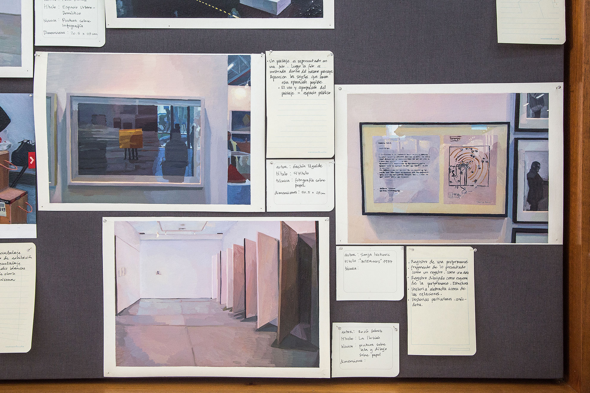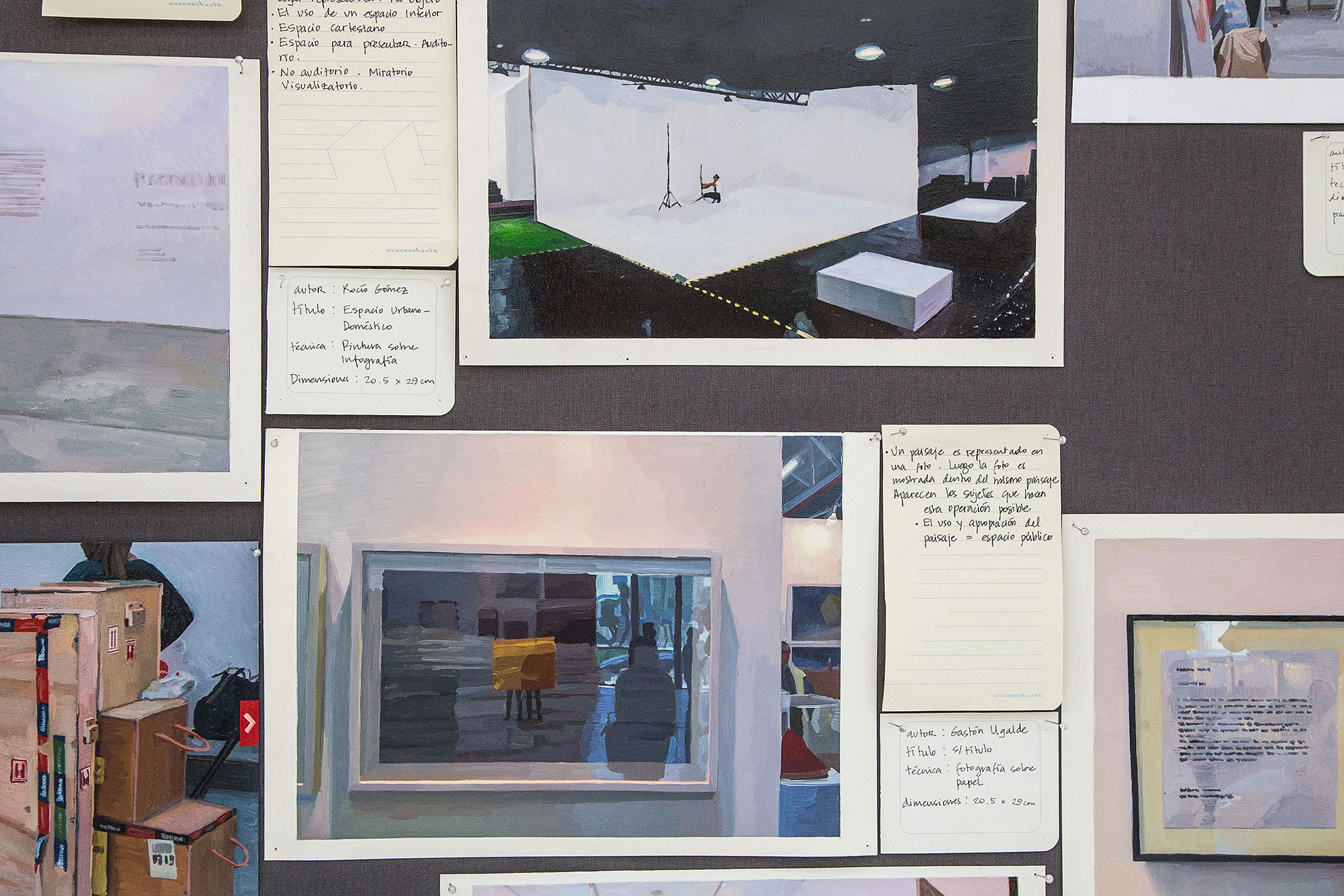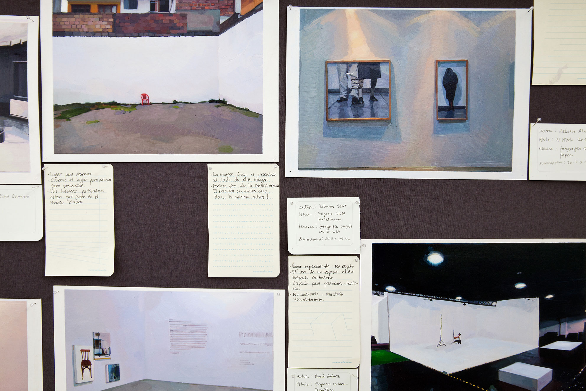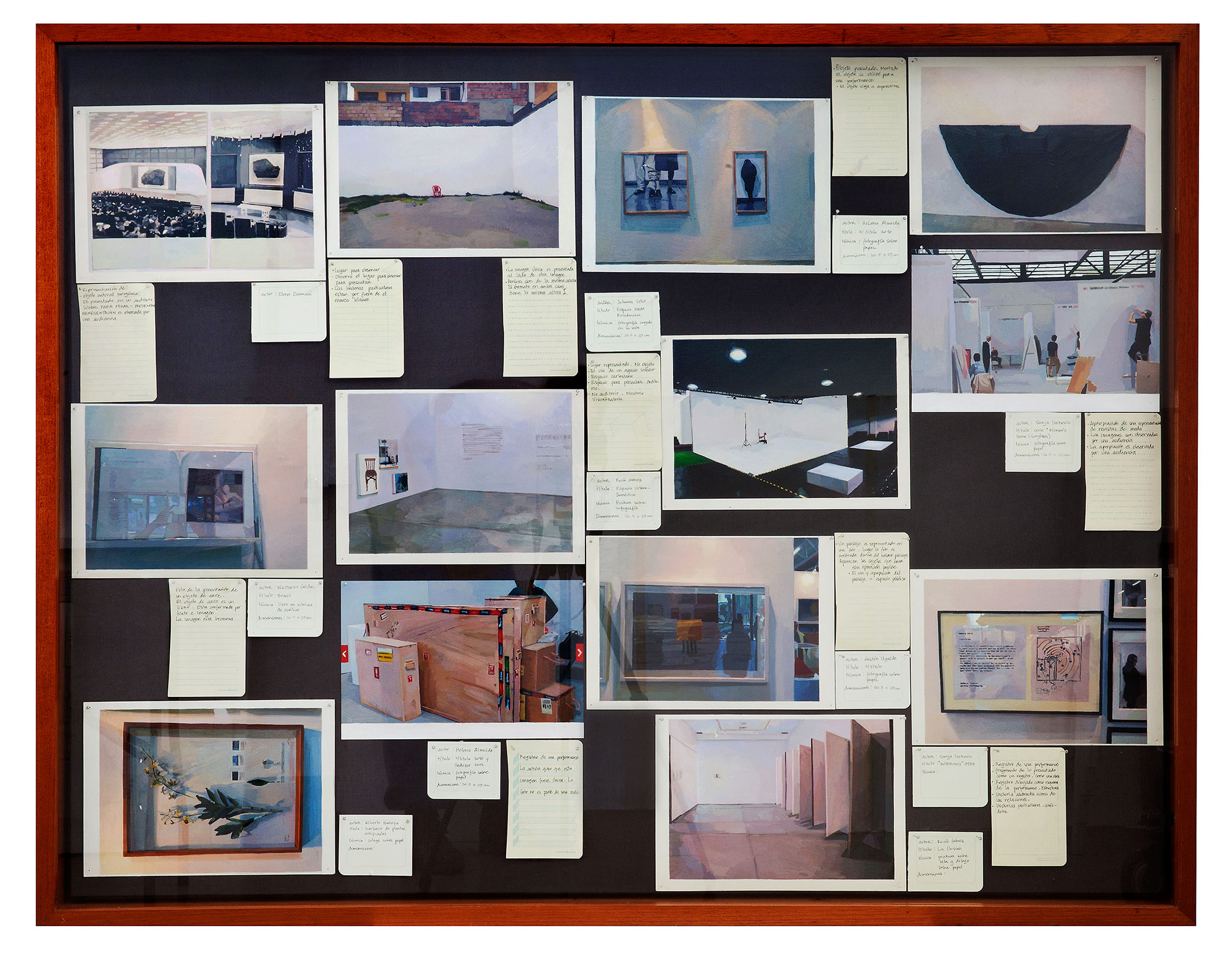 La serie fue pintada a partir del registro fotográfico de distintos espacios expositivos en la ciudad de Bogotá en 2012. Se observan espacios y soportes variados para exhibir algo (que podría o no ser una obra de arte) -paredes blancas y vacías o con obra montada, cajas de acrílico, marcos con vidrios reflectantes, espacios dentro de otros espacios. Estas y otras maneras de exhibir transforman objetos mundanos como una silla, una piedra, un libro o una tela (que resultan inclusive inapropiados para los cánones del arte clásico ) en arte. Funcionan como un señalador que permite al espectador interpretar al objeto desde un lugar del arte, que difiere del científico, el doméstico o el cotidiano.
