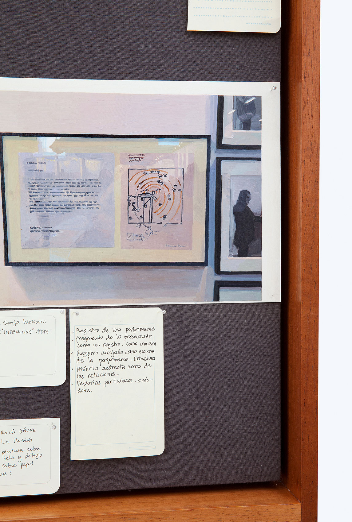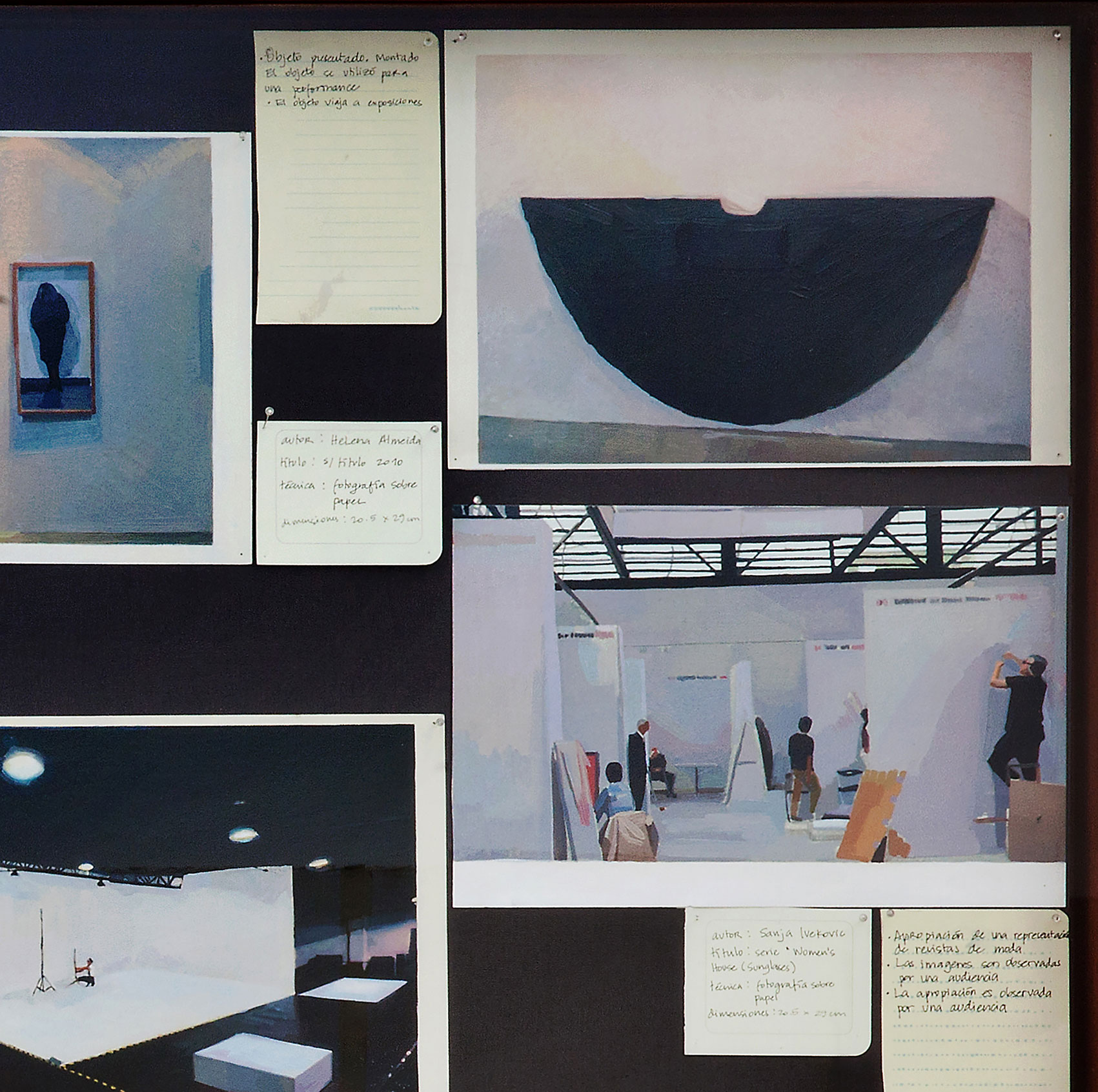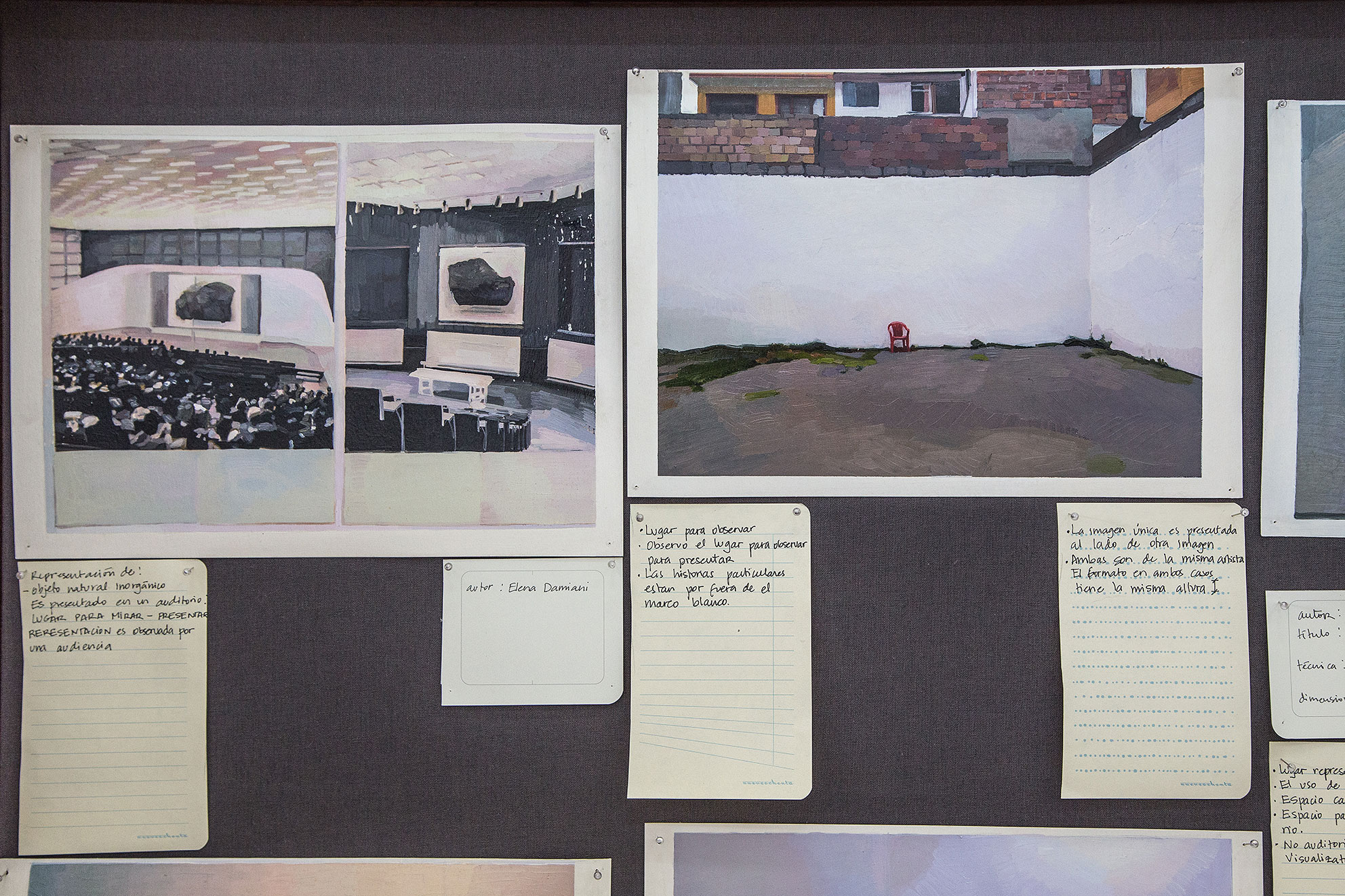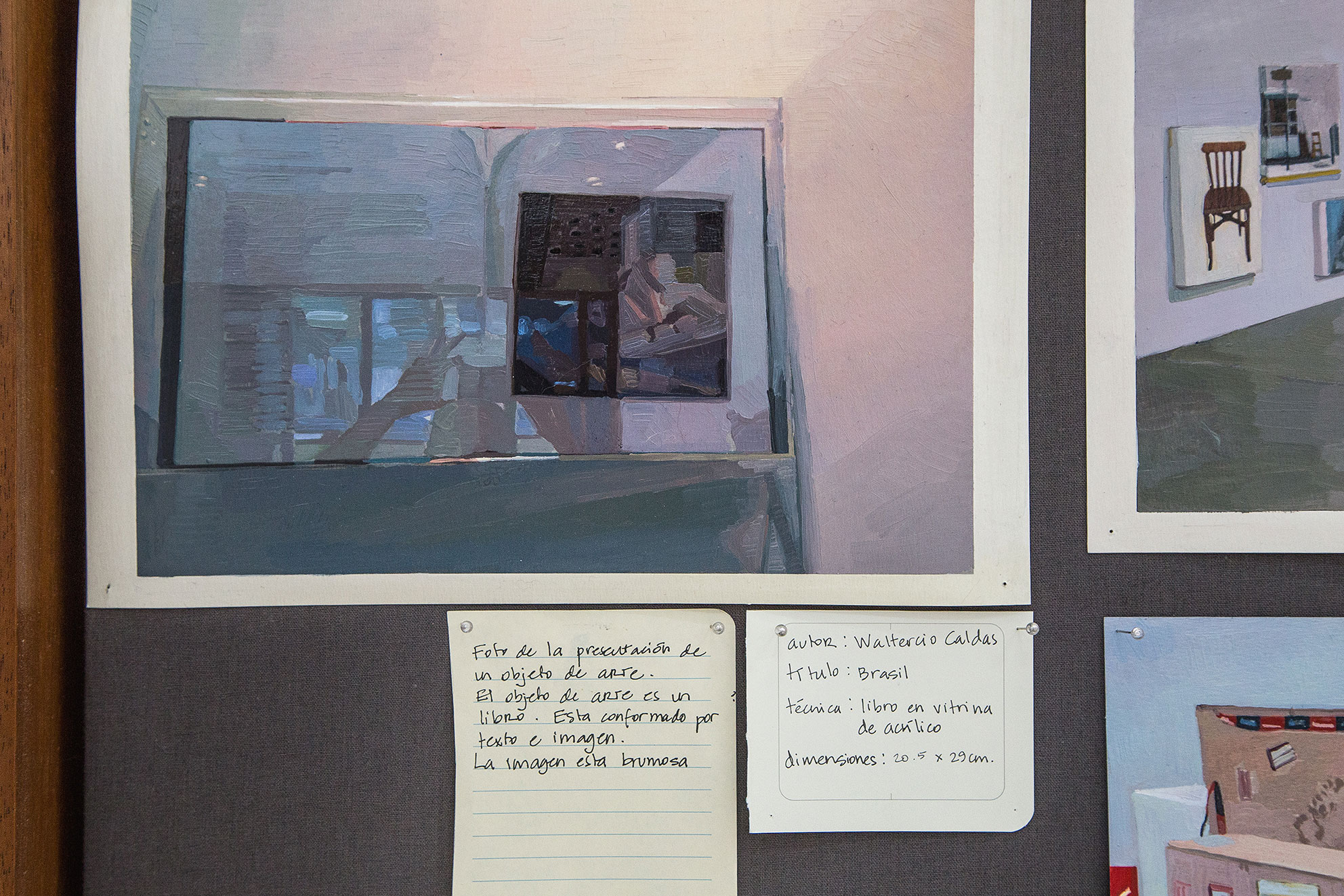 La serie fue pintada a partir del registro fotográfico de distintos espacios expositivos en la ciudad de Bogotá en 2012. Se observan espacios y soportes variados para exhibir algo (que podría o no ser una obra de arte) -paredes blancas y vacías o con obra montada, cajas de acrílico, marcos con vidrios reflectantes, espacios dentro de otros espacios. Estas y otras maneras de exhibir transforman objetos mundanos como una silla, una piedra, un libro o una tela (que resultan inclusive inapropiados para los cánones del arte clásico ) en arte. Funcionan como un señalador que permite al espectador interpretar al objeto desde un lugar del arte, que difiere del científico, el doméstico o el cotidiano.