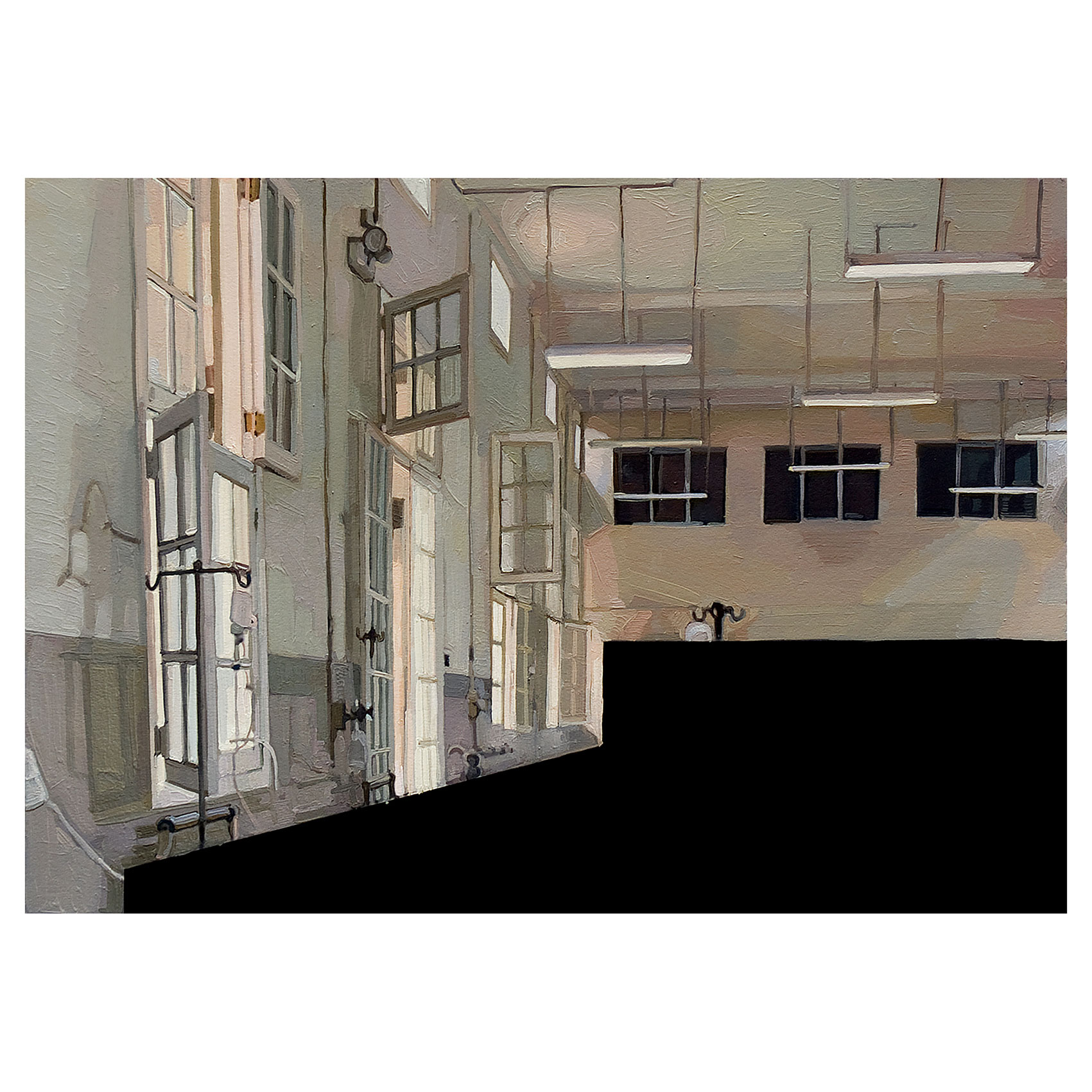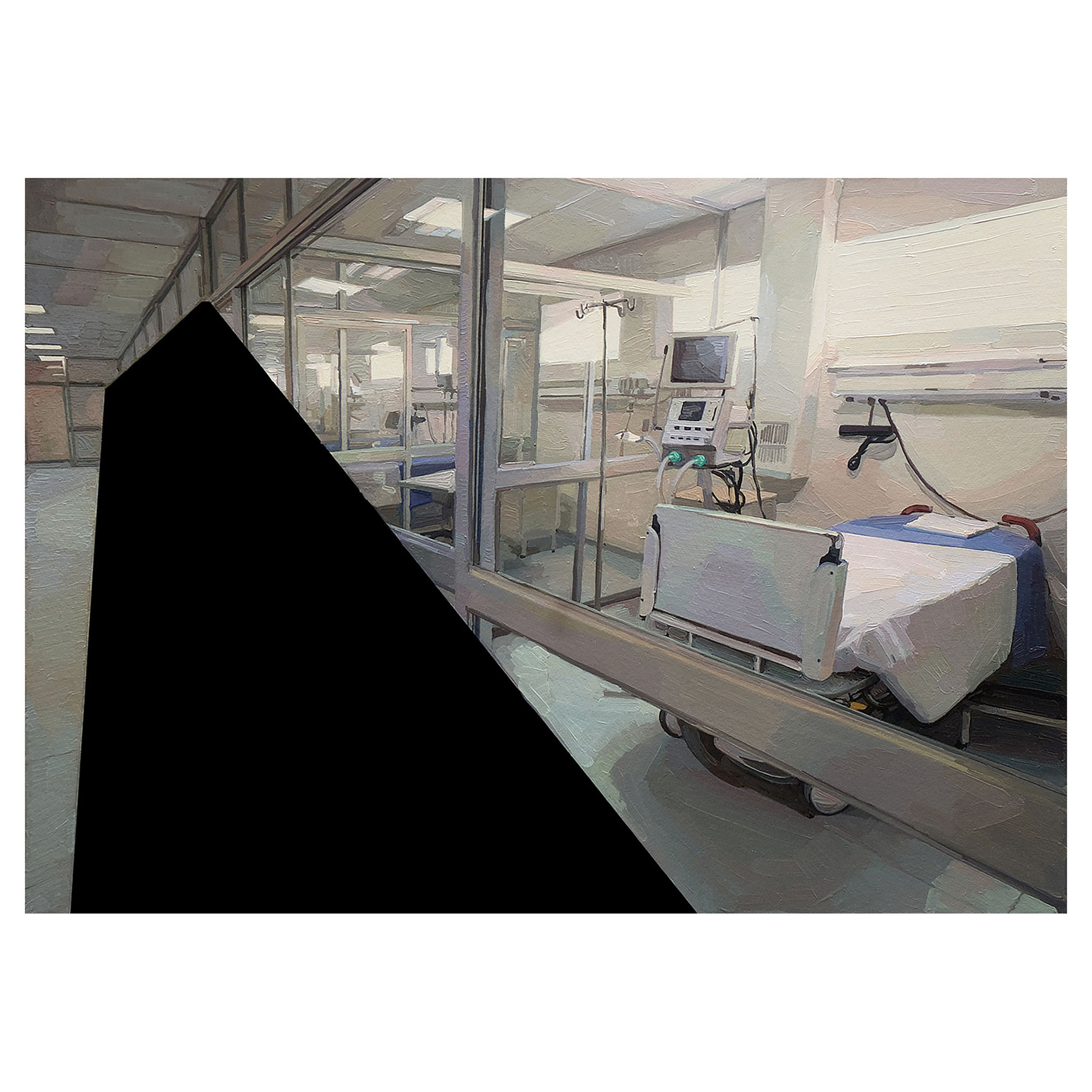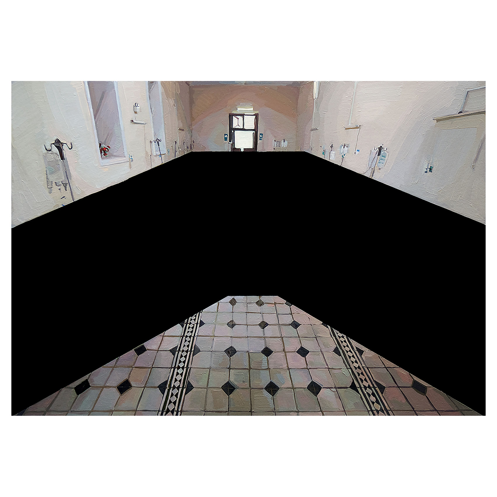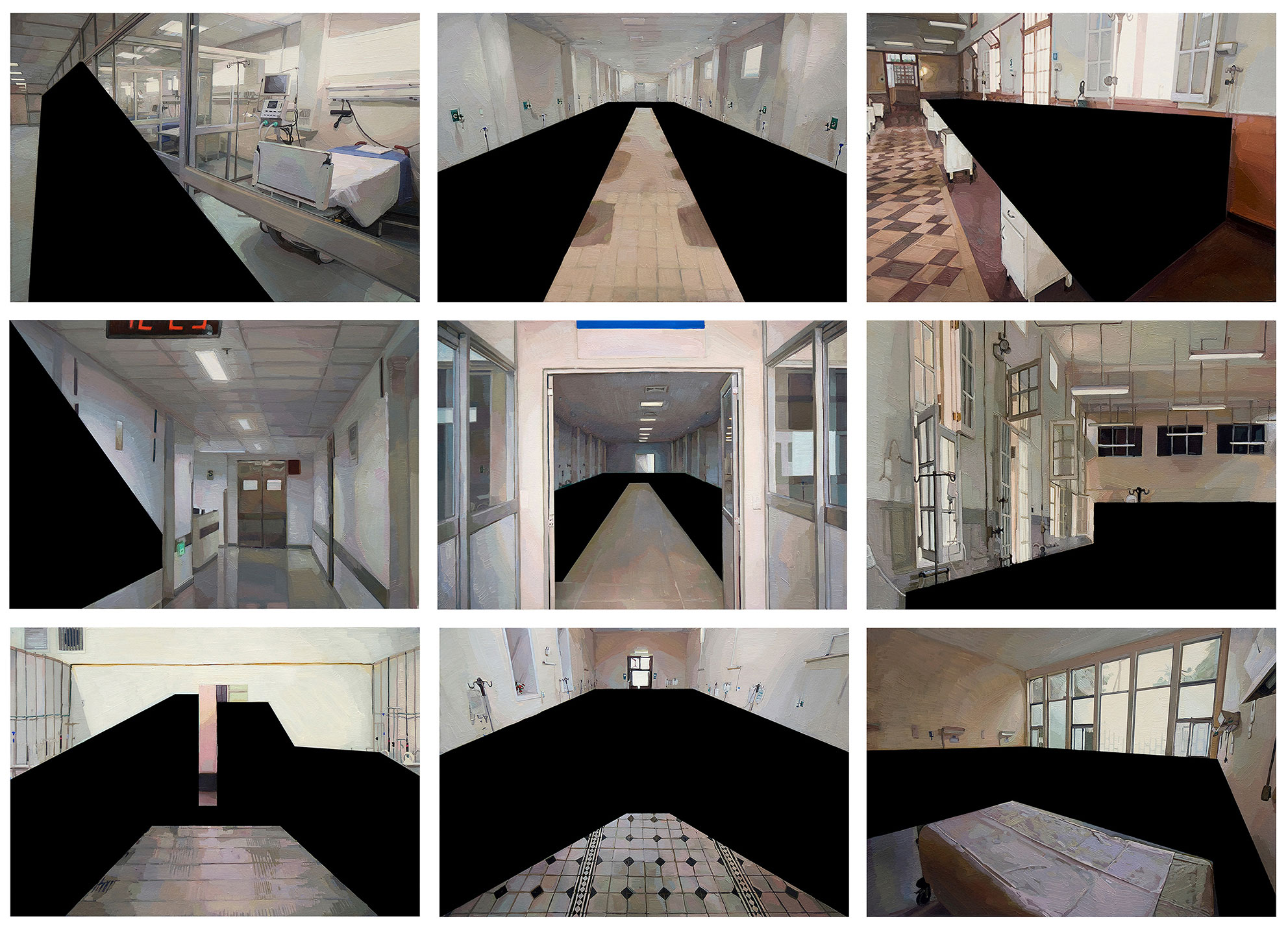 en tránsito es desarrollado durante la pandemia 2021 y tiene como punto de partida mi necesidad de ver. Discurrir visualmente a través de algunas imágenes que calmen mi curiosidad y miedo. ¿Dónde van las personas enfermas, como son los paisajes interiores de los hospitales de Lima, donde posarán su mirada, que los rodeará y acompañara?. Luego de revisar parte del universo de imágenes fotográficas a las que internet me da acceso, solo logro una insatisfacción ante las secciones recortadas que obtengo. Las noticias y sus imágenes me muestran una versión editada, que pareciera haber sido edulcorada para calmar la ansiedad sin entregar mucho de realidad. Corredores, salas de recuperación, salas de cuidados intensivos; arquitecturas de distintas épocas y estilos que en la mayoría de casos buscan compartir con el lector una versión correcta de las medidas oficiales ante la crisis. Una versión de la que se desligue que se están tomando las medidas adecuadas, que nuestros hospitales están a la altura de la tecnología desplegada en otros lugares del mundo.